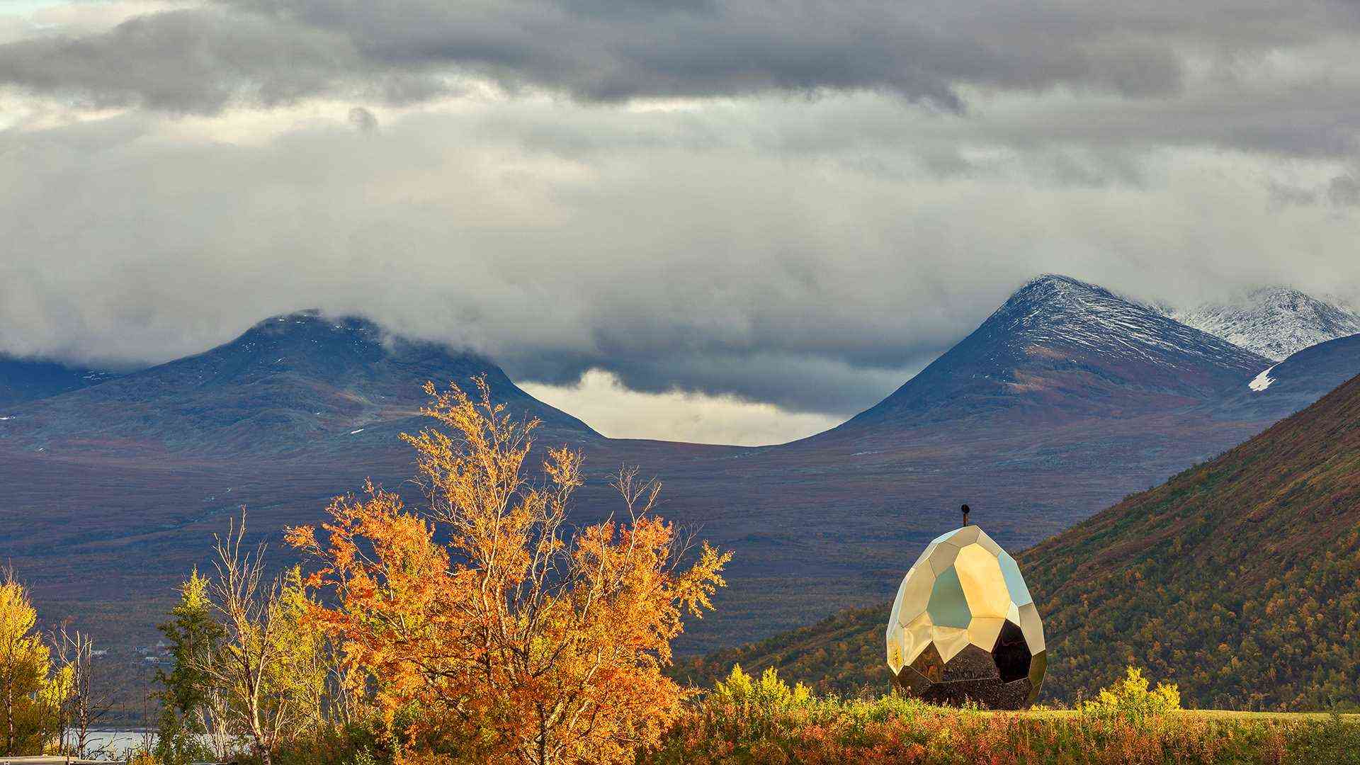 As a symbol of new beginnings Solar Egg was commissioned by Swedish housing company Riksbyggen and created by Swedish artists Mats Bigert and Lars Bergström. The saunas exterior consists of 69 golden plates reflecting the landscape and its inhabitants. It is heated by a heart-shaped wood-fired burner and can accommodate up to eight persons. Solar Egg captures Kiruna's fantastic spirit and at the same time it's old sauna traditions.