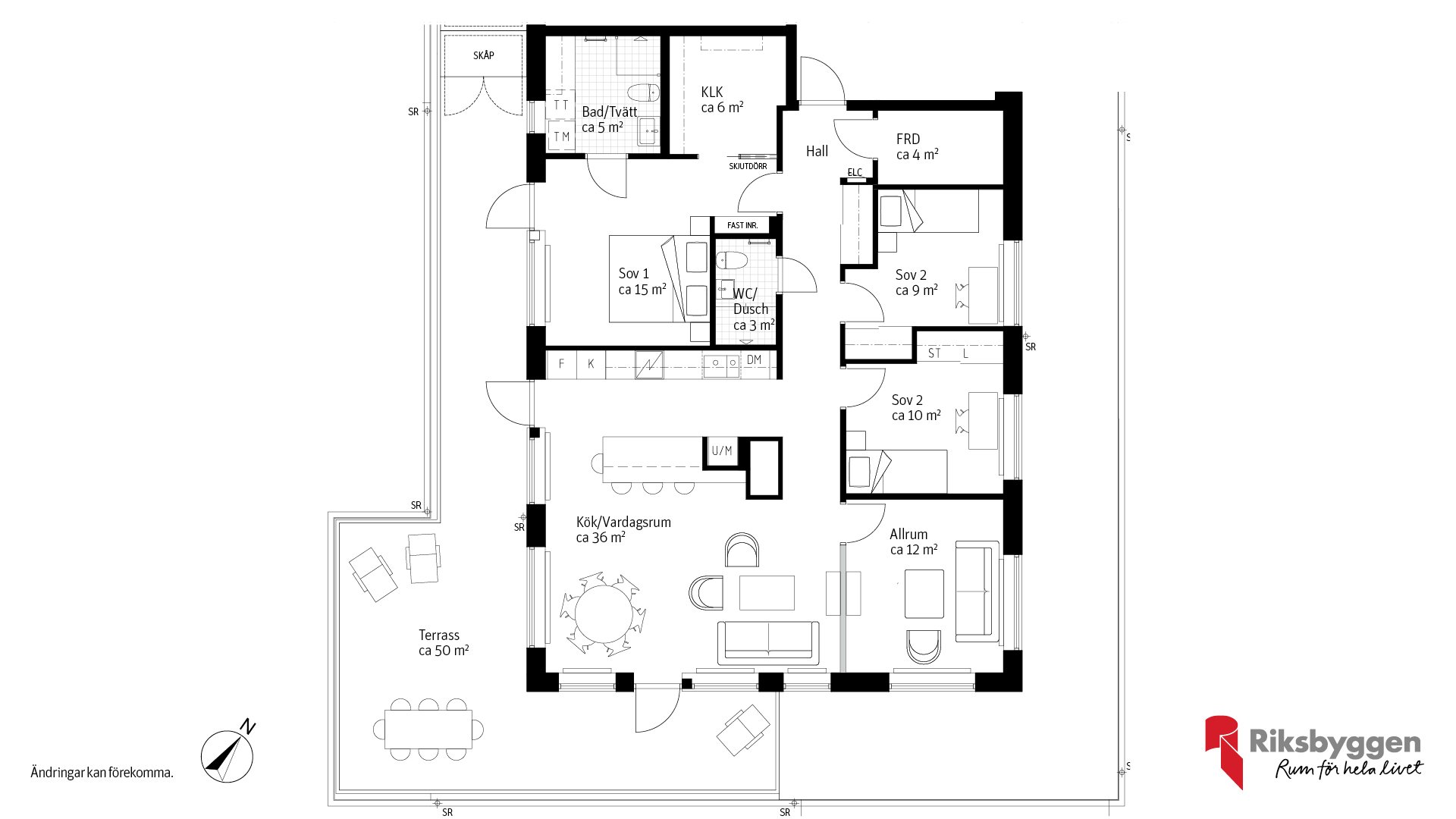 Rymlig femrummare med generösa ytor och smart planlösning. Det stora öppna köket och vardagsrummet skapar en perfekt samlingspunkt för familjen. Det separata allrummet ger extra flexibilitet för kontor eller lek, eller varför inte ta bort väggen och skapa ett enormt vardagsrum? Tre sovrum passar perfekt för familj eller för dig som behöver hemmakontor. Badrummet har tvättmaskin och torktumlare. Dessutom finns en extra WC/dusch som gör vardagen smidig. Klädkammare och förråd ger gott om förvaringsutrymmen. Den fantastiska terrassen blir ditt eget privata uterum.