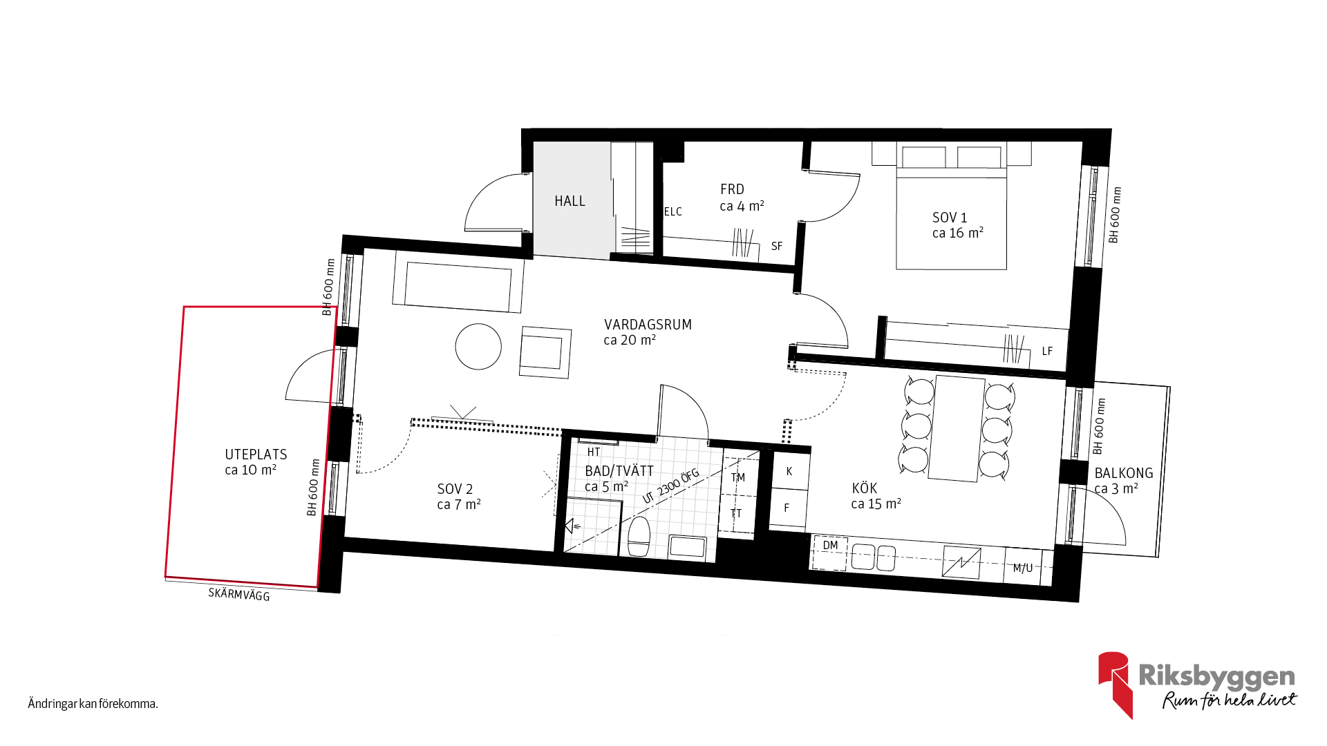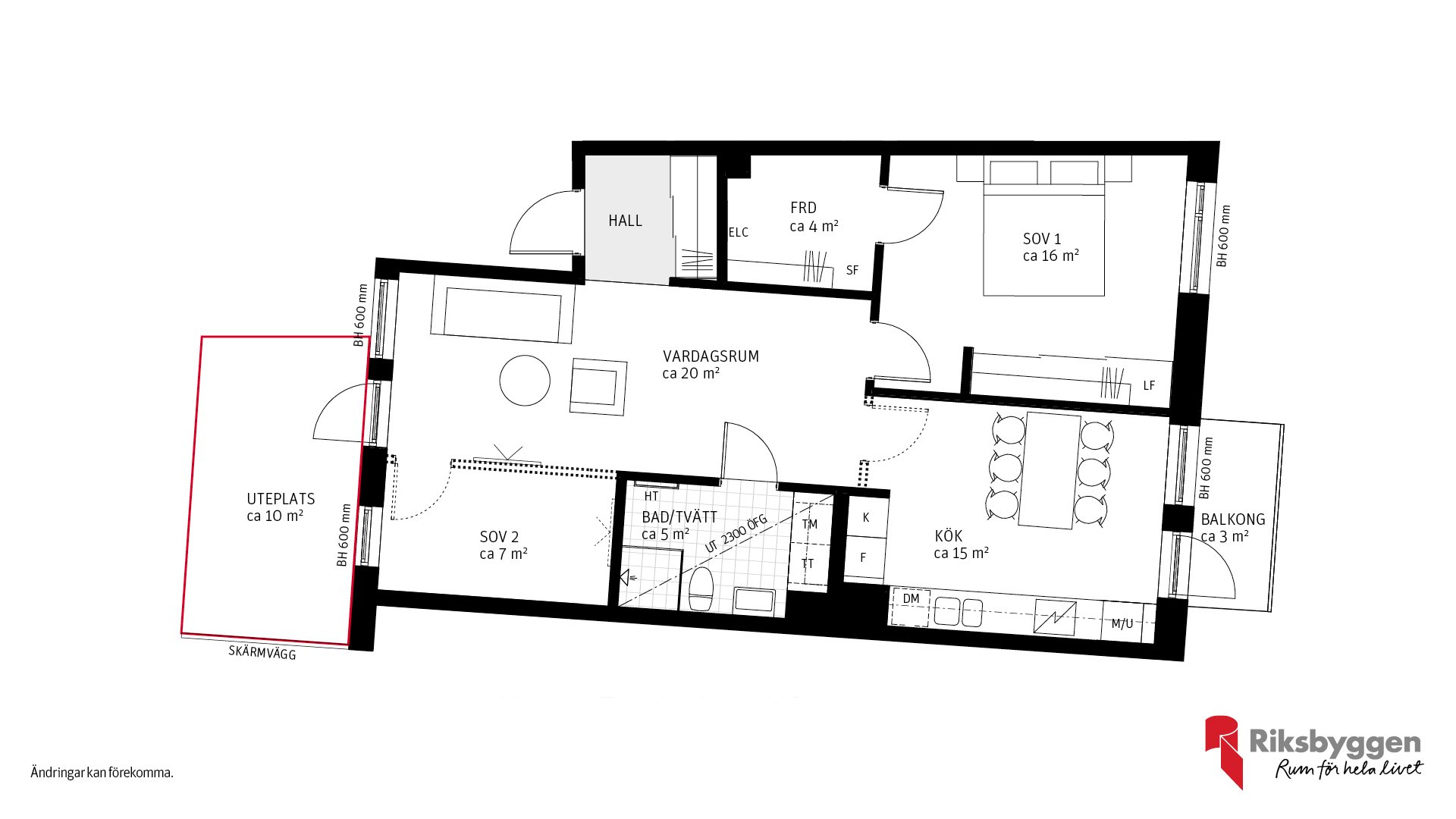 En tvåa om 74 kvm med både uteplats och balkong. Hall med skjutdörrsgarderob. Rymligt vardagsrum med utgång till utelplats. . Kök med plats för matgrupp, utgång till balkong i öster. Sovrum med skjutdörrsgarderob och förråd. Badrum med tvättmaskin och torktumlare.