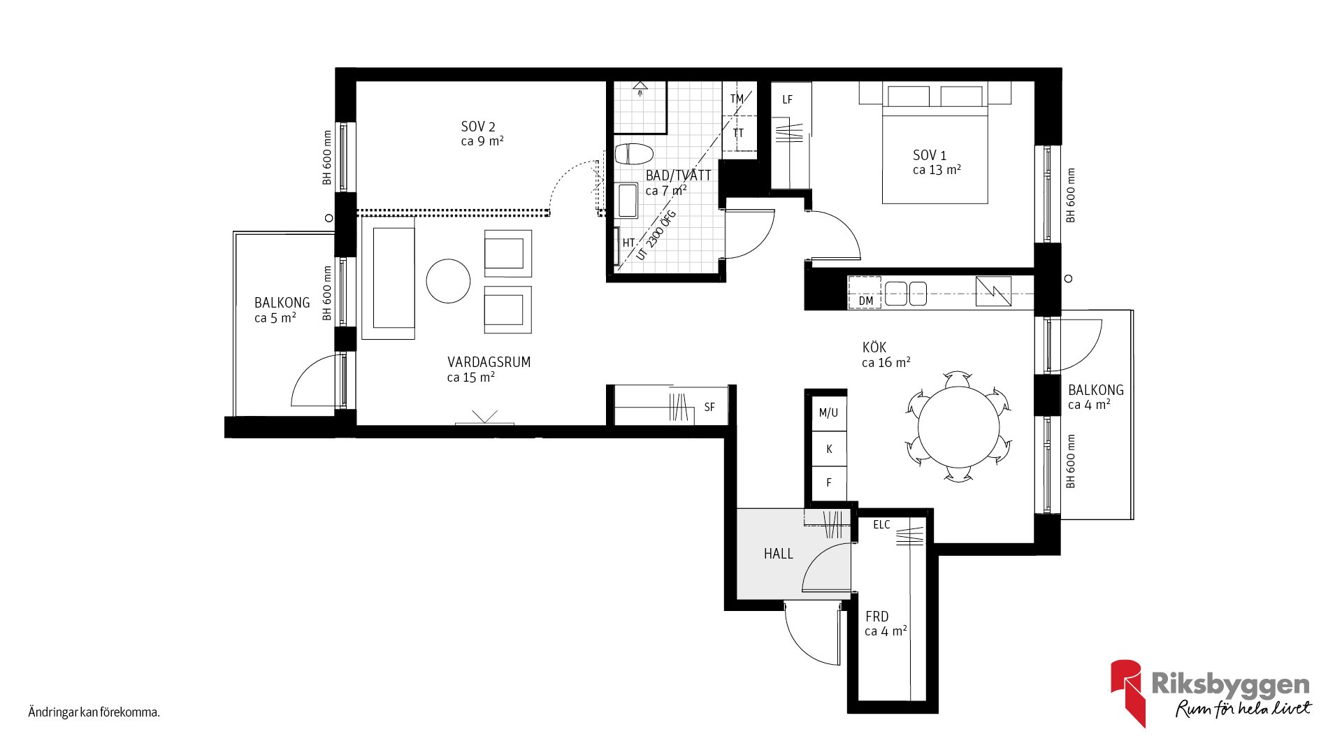 En genomgångstrea på fjärde våningen med två balkonger. Hall med förråd i anslutning. Vardagsrum med utgångt till balkong i väster. Möjlighet att göra ett större vardagsrum om yta önskas med frånval av sovrum 2. Kök med matplats och utgång till balkong i öster. Sovrum 1 med skjutdörrsgarderob. Badrum med tvättmaskin och torktumlare.