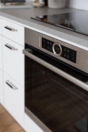 Köken och badrummen i Brf Callmare Fästning är omsorgsfullt utformade med inredning från Vedum och vitvaror i rostfritt från Bosch.