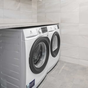 Inredning från Svedbergs, spegelskåp med belysning, kommod med tvättställ vit, väggskåp över tvättmaskin och torktumlare vit.
