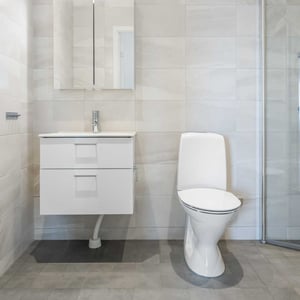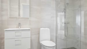 Badrummet är lika omsorgsfullt utformat, med kakel och klinker som matchar kökets färg- och materialval. Resultatet är ett enhetligt, lugnt och elegant intryck i hela bostaden.