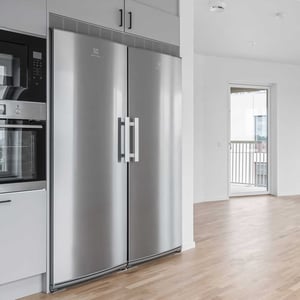 Vita eller grå skåpssnickerier från Vedum (Maja), vitt kakel, samt rostfria vitvaror från Electrolux kyl/frys, induktionshäll, inbyggnadsugn, inbyggnadsmicro, helintegrerad diskmaskin. Alla lägenheter har grå eller träfärgad laminatbänkskiva