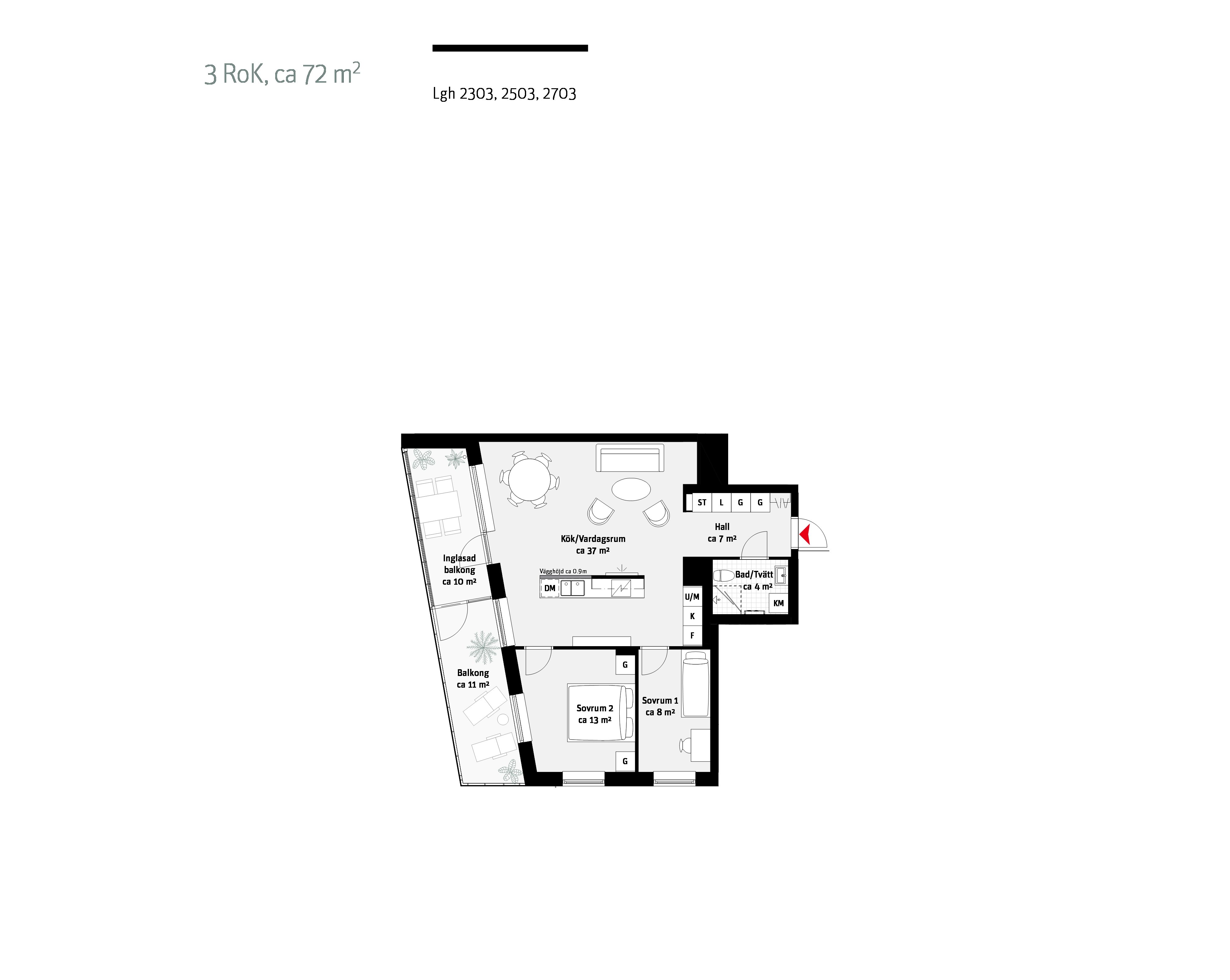 • 3 rum och kök 72 kvm: Lägenhet 1102, 1502 och 1802