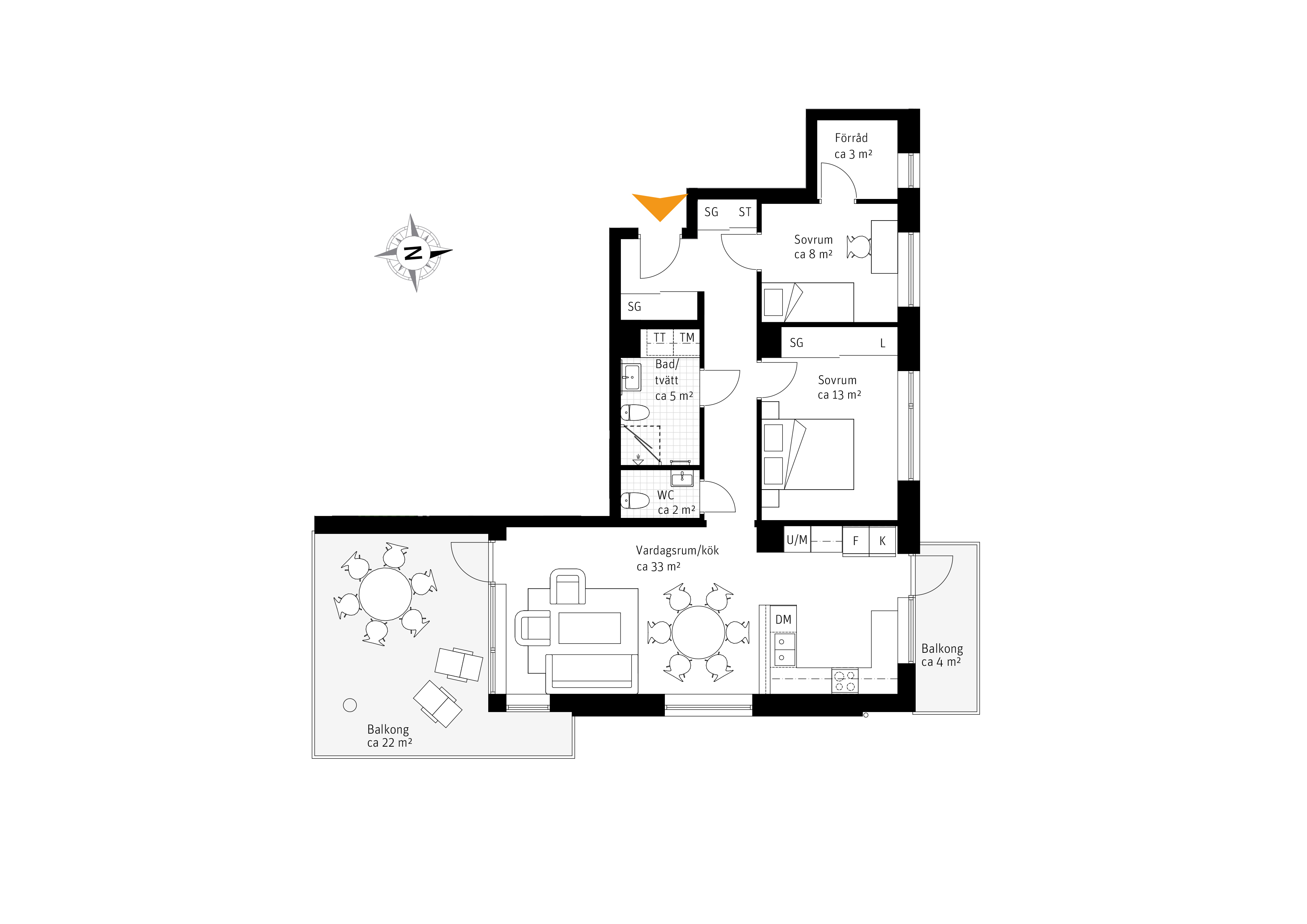 Yteffektiv 3 rumslägenhet på fjärde våningen med två balkonger. Balkongen i anslutning till vardagsrummet är ca 22 kvm med söderläge och balkongen vid köket är på ca 4 kvm. Helkaklat badrum med tvättmaskin och torktumlare. Gästtoalett. Förråd i lägenheten om ca 3 kvm.