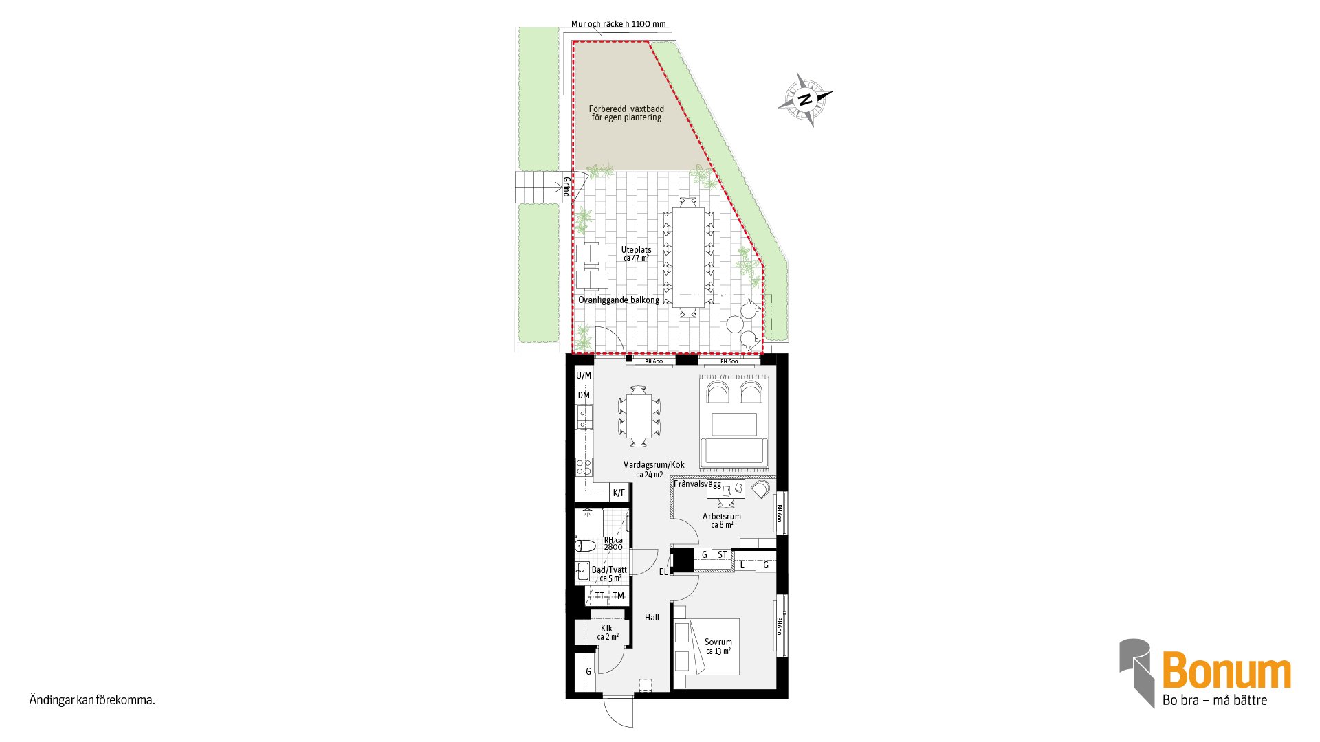 Gavellägenhet med fönster i två väderstreck, 3 rum och kök om 66 kvm. Lägenheten ligger i markplan med uteplats där det finns bla. en växtbädd förberedd för plantering. Kök och vardagsrum i anslutning till uteplatsen. Arbetsrummet kan väljas bort och då får lägenheten ett större vardagsrum/kök. Det finns klädkammare och skjutdörrsgarderober samt ett källarförråd till de saker som du inte använder varje dag. I badrummet finns torktumlare och tvättmaskin.