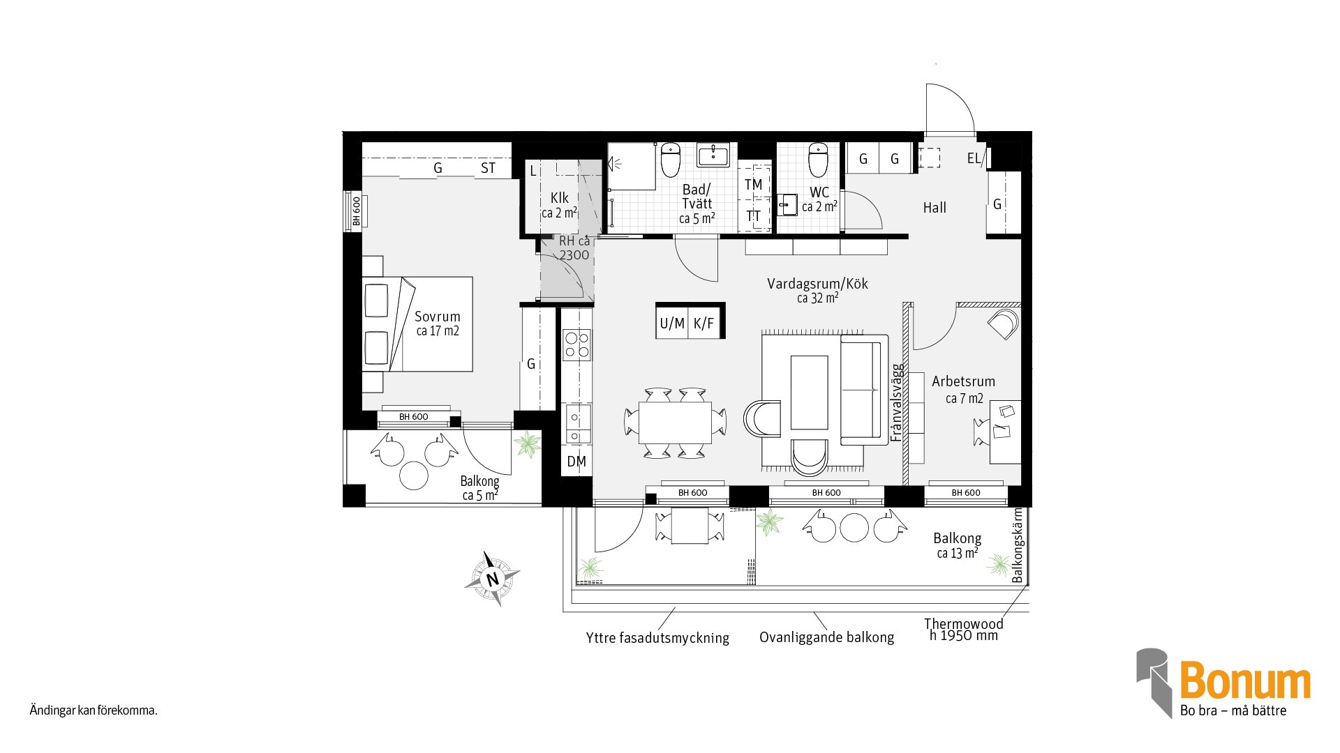 Gavellägenhet med fönster i två väderstreck, 3 rum och kök om 75 kvm, med två balkonger som vetter mot Råbysjön. Den större balkongen är delvis inglasad. Balkongerna nås via vardagsrum och sovrummet. Kök och vardagsrum i öppen planlösning. Vill du ha ett större vardagsrum kan du välja bort arbetsrummet. Förvaring i skjutdörrsgarderober samt i en klädkammare. I badrummet finns torktumlare och tvättmaskin, Gästwc finns vid lägenhetsentrén.