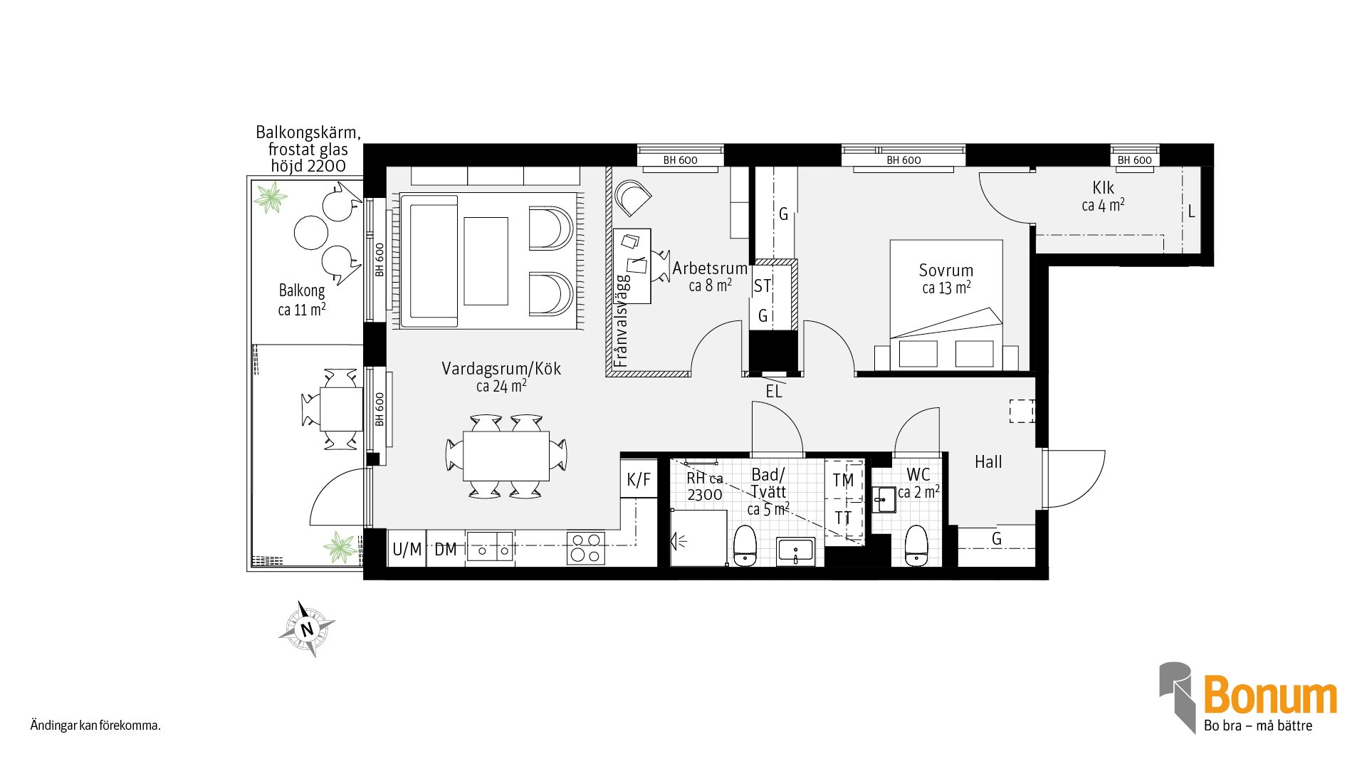 Gavellägenhet med fönster i två väderstreck, 3 rum och kök om 70 kvm, med delvis inglasad balkong. Kök och vardagsrum i öppen planlösning i anslutning till balkongen. Arbetsrummet kan väljas bort om du vill ha ett större vardagsrum. Förvaring sker i skjutdörrsgarderober men dessutom finns en klädkammare. I badrummet finns torktumlare och tvättmaskin. Gästwc finns vid lägenhetsentrén.