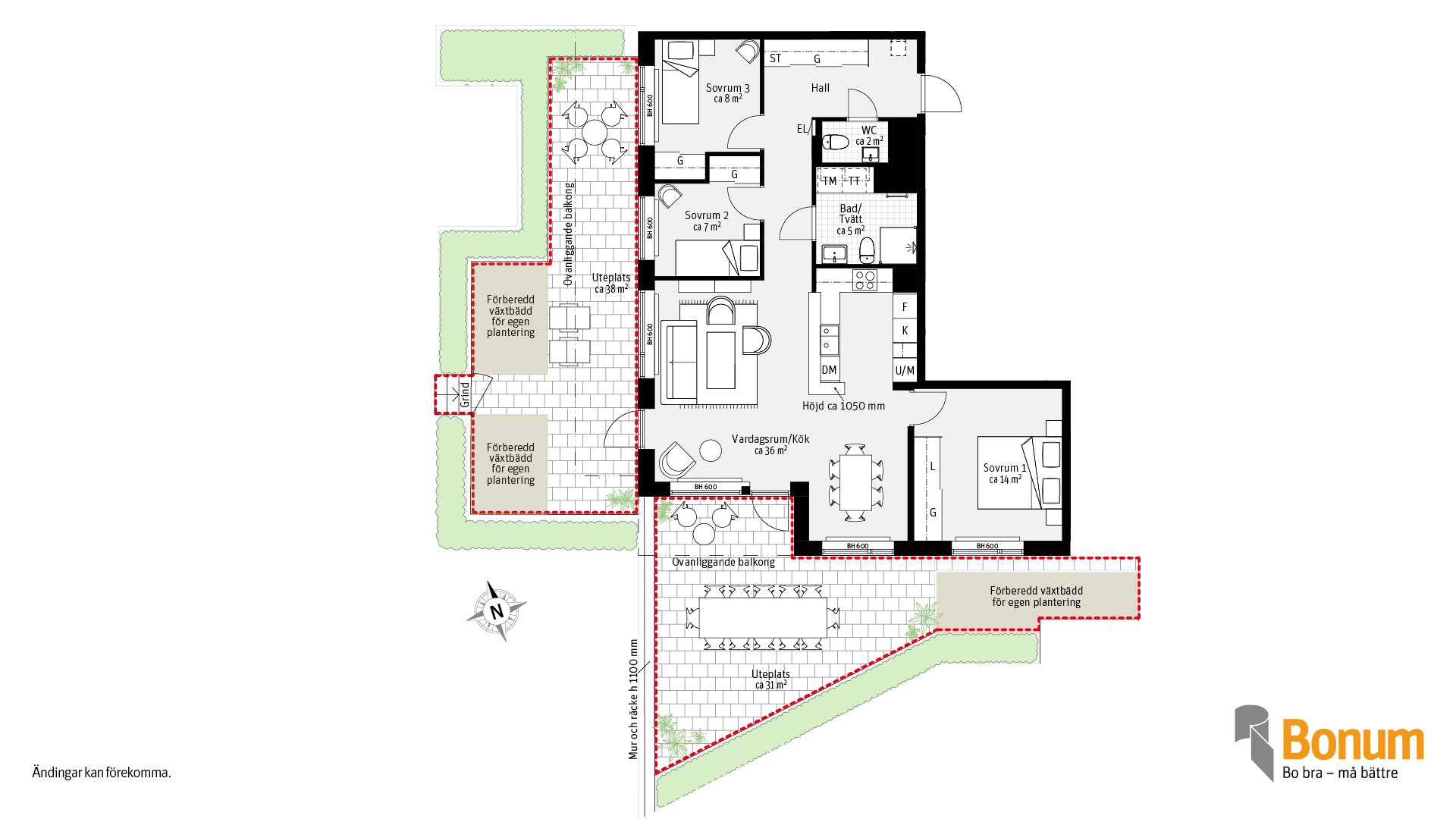 Gavellägenhet, 4 rum och kök ca 88 kvm. med fönster i två väderstreck. Lägenheten ligger i markplan och har två uteplatser med växtbäddar förberedda för egen plantering. Kök och vardagsrum i öppen planlösning men köket är delvis avskilt från vardagsrummet. Från vardagsrummet når du båda uteplatserna som ligger i olika väderstreck. 3 sovrum med skjutdörrsgarderober. I badrummet finns tvättmaskin och torktumlare. Vid lägenhetsentrén finns ett gästwc,