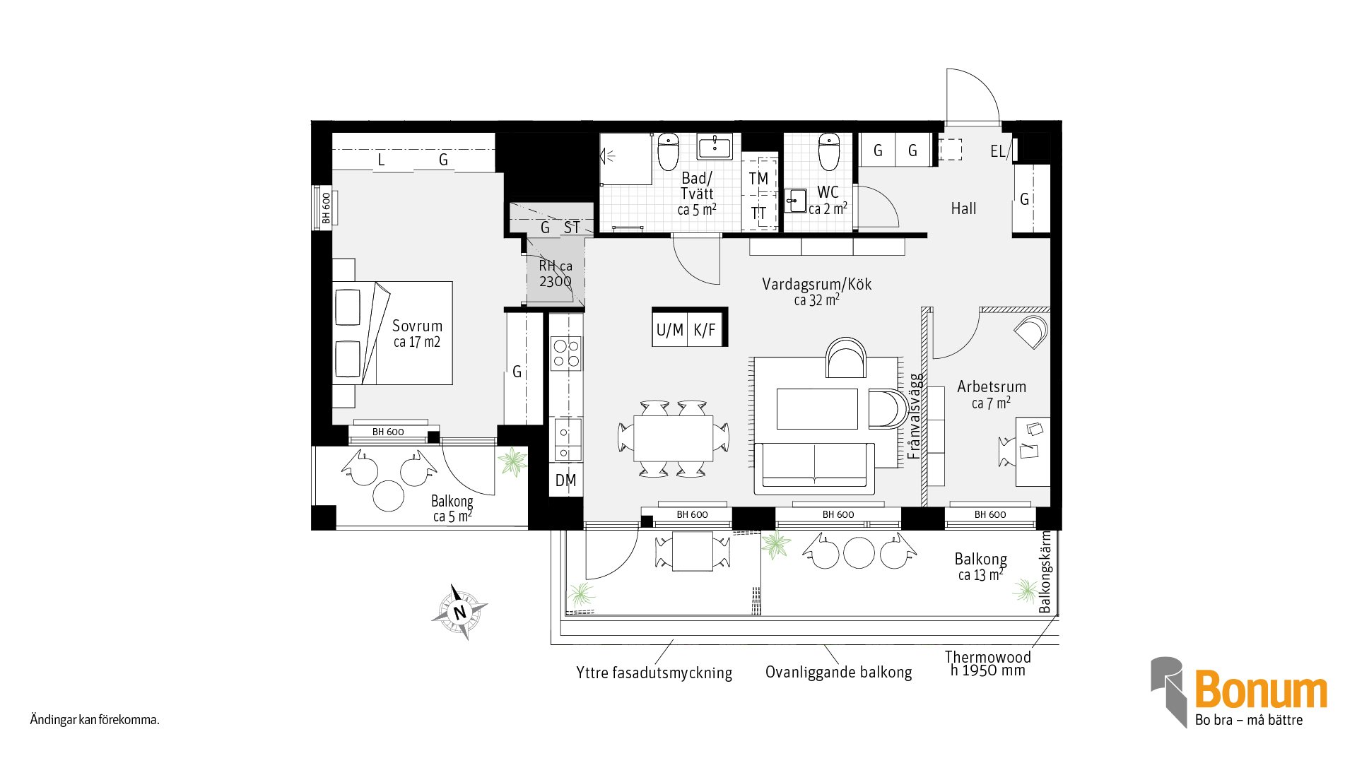 Gavellägenhet med fönster i två väderstreck, 3 rum och kök om 74 kvm, med två balkonger som vetter mot innergården. Den större balkongen är delvis inglasad. Balkongerna nås via vardagsrum och sovrummet. Kök och vardagsrum i öppen planlösning. Vill du ha ett större vardagsrum kan du välja bort arbetsrummet. Förvaring i skjutdörrsgarderober samt i en klädkammare. I badrummet finns torktumlare och tvättmaskin, Gästwc finns vid lägenhetsentrén.