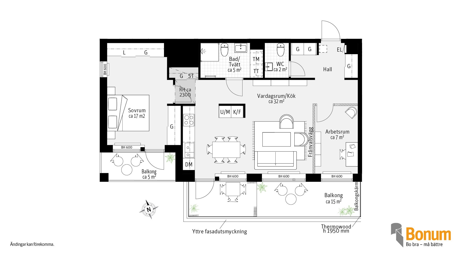 Gavellägenhet med fönster i två väderstreck, 3 rum och kök om 74 kvm, med två balkonger som vetter mot innergården. Den större balkongen är delvis inglasad. Balkongerna nås via vardagsrum och sovrummet. Kök och vardagsrum i öppen planlösning. Vill du ha ett större vardagsrum kan du välja bort arbetsrummet. Förvaring i skjutdörrsgarderober samt i en klädkammare. I badrummet finns torktumlare och tvättmaskin, Gästwc finns vid lägenhetsentrén.