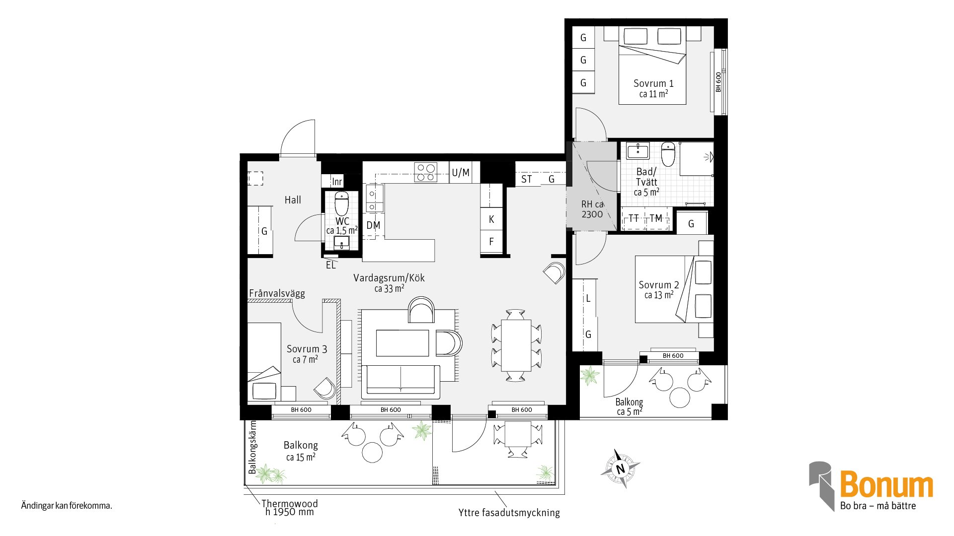 Rymlig gavellägenhet, 4 rok om 89 kvm, med två balkonger varav den största balkongen är delvis inglasad. Lägenhetens balkonger vetter mot innergården. Separat "sovavdelning" med två sovrum samt badrum med torktumlare och tvättmaskin. Från ett av sovrummen når du den mindre av lägenhetens två balkonger. Lägenheten har öppen planlösning mellan vardagsrum och kök men köket är delvis avskilt. Vardagsrummet kan göras större genom frånval av ett av sovrummen. Gästwc finns vid entrén.