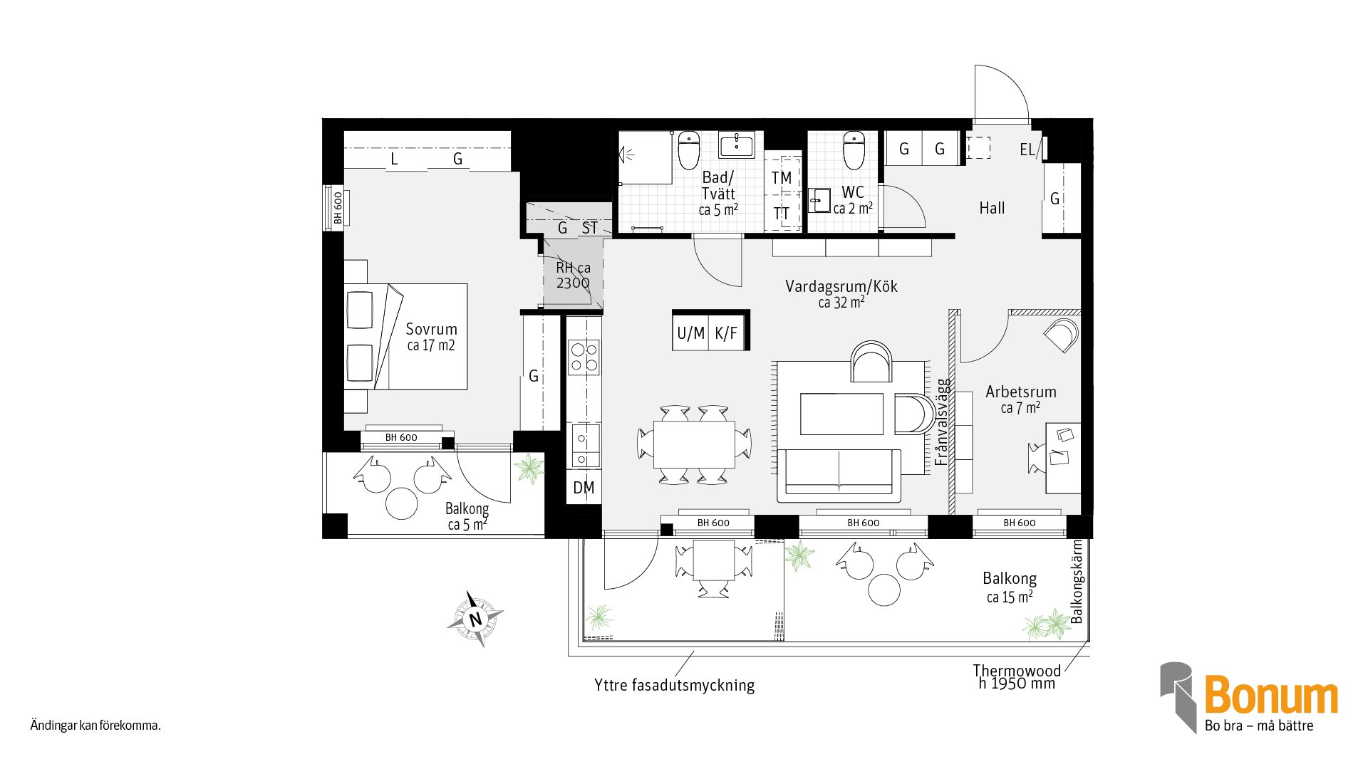 Gavellägenhet med fönster i två väderstreck, 3 rum och kök om 74 kvm, med två balkonger som vetter mot innergården. Den större balkongen är delvis inglasad. Balkongerna nås via vardagsrum och sovrummet. Kök och vardagsrum i öppen planlösning. Vill du ha ett större vardagsrum kan du välja bort arbetsrummet. Förvaring i skjutdörrsgarderober samt i en klädkammare. I badrummet finns torktumlare och tvättmaskin, Gästwc finns vid lägenhetsentrén.