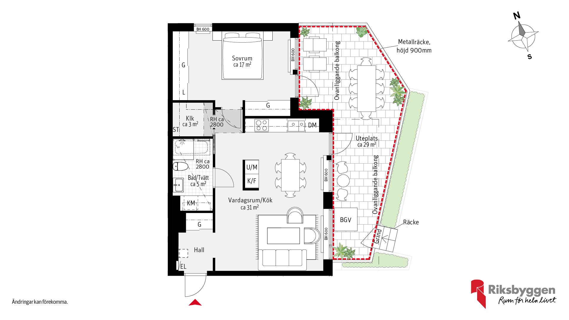 Gavellägenhet med fönster i två väderstreck, 2 rum och kök ca 61 kvm, i markplan med uteplats om hela 2 kvm. Kök och vardagsrum i öppen planlösning med utgång till uteplatsen. Förvaring sker i skutdörrsgarderober eller i klädkammaren. I badrummet finns tvättutrustning..