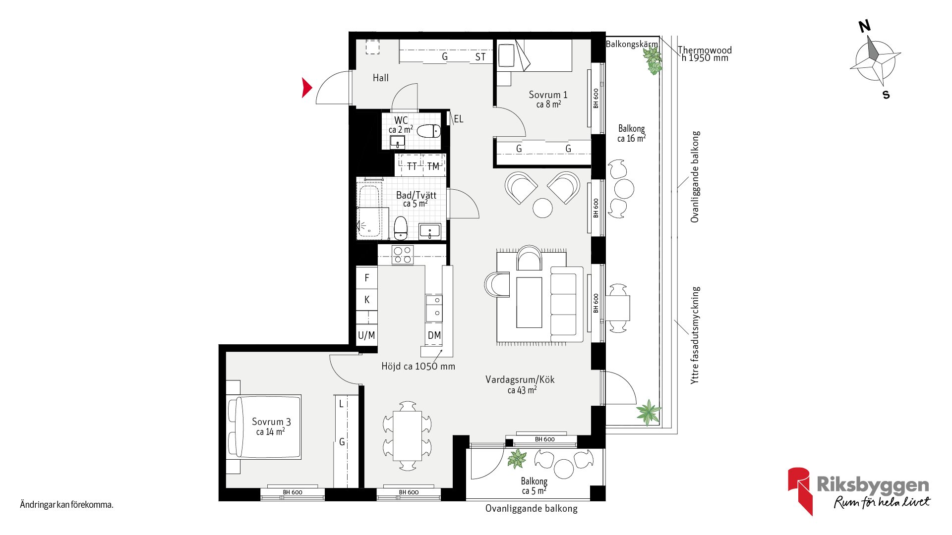 Gavellägenhet, 4 rum och kök om ca 88 kvm, med fönster i två väderstreck. Lägenheten har två balkonger som vetter mot olika väderstreck. Utgång till balkongerna från vardagsrummet. Kök och vardagsrum i öppen planslöning men köket är delvis avskilt från vardagsrummet. I lägenheten finns 3 sovrum i vilka det finns skjutdörrsgarderober. I badrummet finns torktumlare och tvättmaskin. Vid lägenhetsentrén finns ett gästwc.