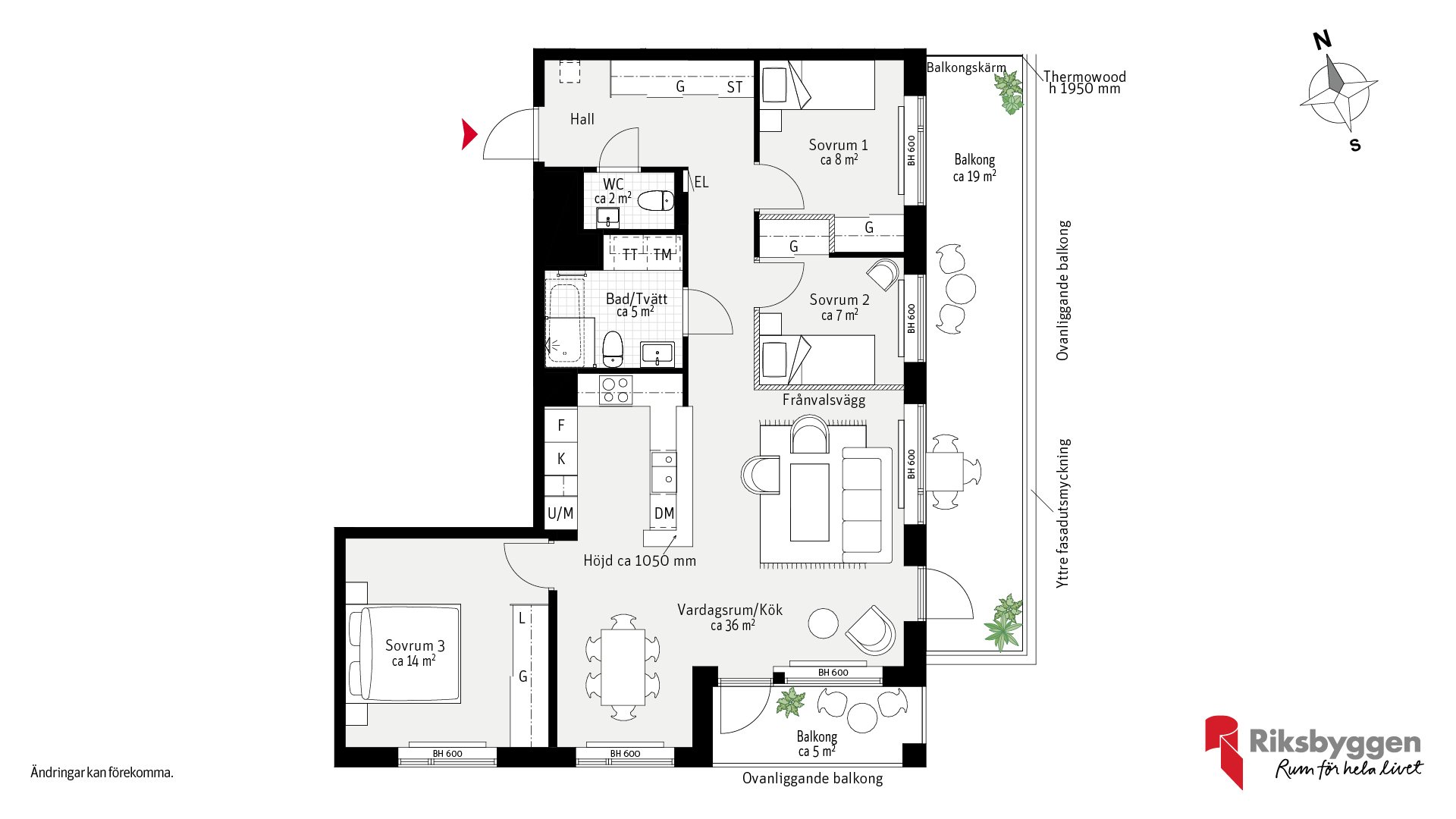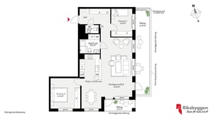 Gavellägenhet, 4 rum och kök om ca 88 kvm, med fönster i två väderstreck. Lägenheten har två balkonger som vetter mot olika väderstreck. Utgång till balkongerna från vardagsrummet. Kök och vardagsrum i öppen planslöning men köket är delvis avskilt från vardagsrummet. I lägenheten finns 3 sovrum i vilka det finns skjutdörrsgarderober. I badrummet finns torktumlare och tvättmaskin. Vid lägenhetsentrén finns ett gästwc.