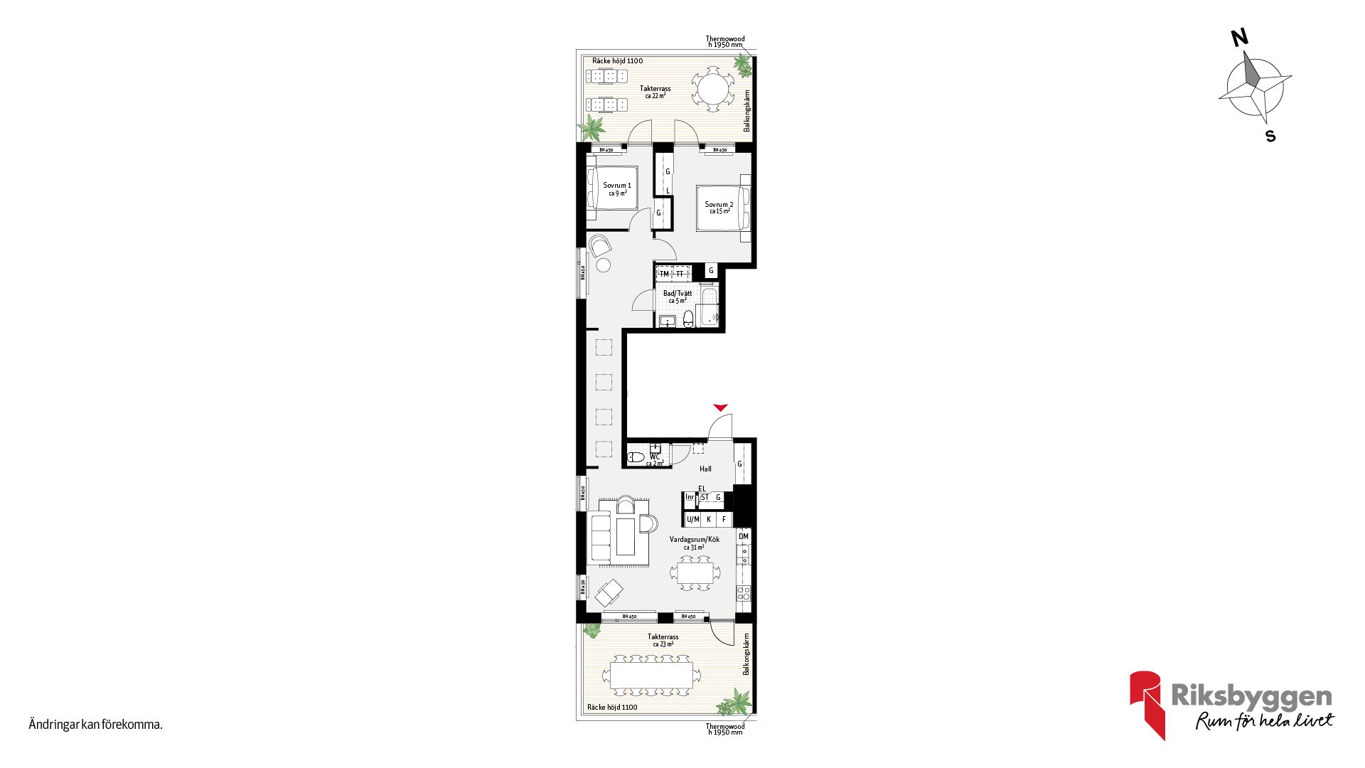 Gavellägenhet med villakänsla på översta våningen med fönster i tre väderstreck. Lägenheten har två terrasser i olika väderstreck. Lägenheten har en tydlig uppdelning mellan den privata och sociala delen, genom en hall med takfönster som binder samman de båda delarna. Kök och vardagsrum i öppen planlösning med utgång till terrass. Vid lägenhetsentrén finns ett gästwc. I den privata delen finns 2 sovrum med access till terrass. Här finns ett badrum med tvättmaskin och torktumlare.