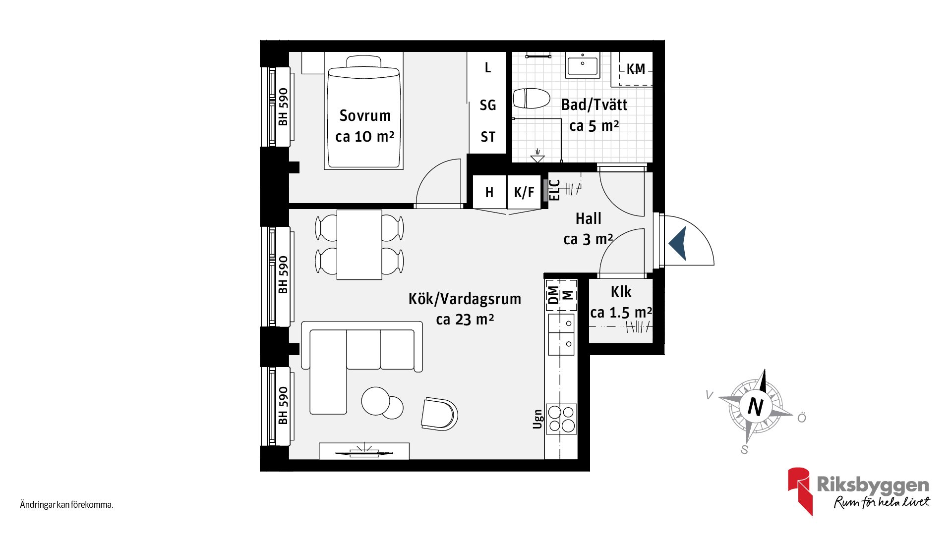 Yteffektiv tvåa med öppen planlösning mellan kök och vardagsrum. Köket har rostfri kyl/frys, inbyggnadsmikro i högskåp och helintegrerad diskmaskin. Helkaklat badrum med kombimaskin som gör livet lite enklare.