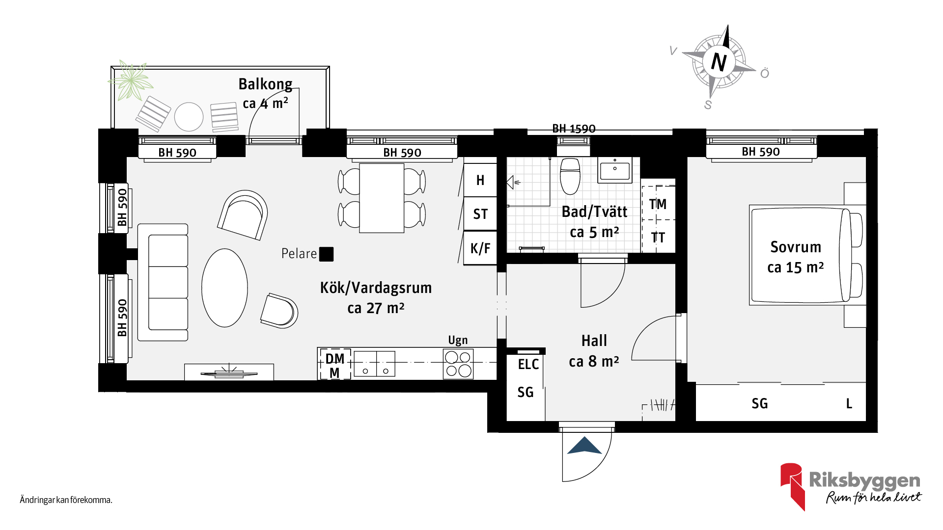 Hörntvåa med utgång till balkong från det kombinerade köket och vardagsrummet. Rymligt sovrum med garderobsvägg. Helkaklat badrum med tvättmaskin och torktumlare.