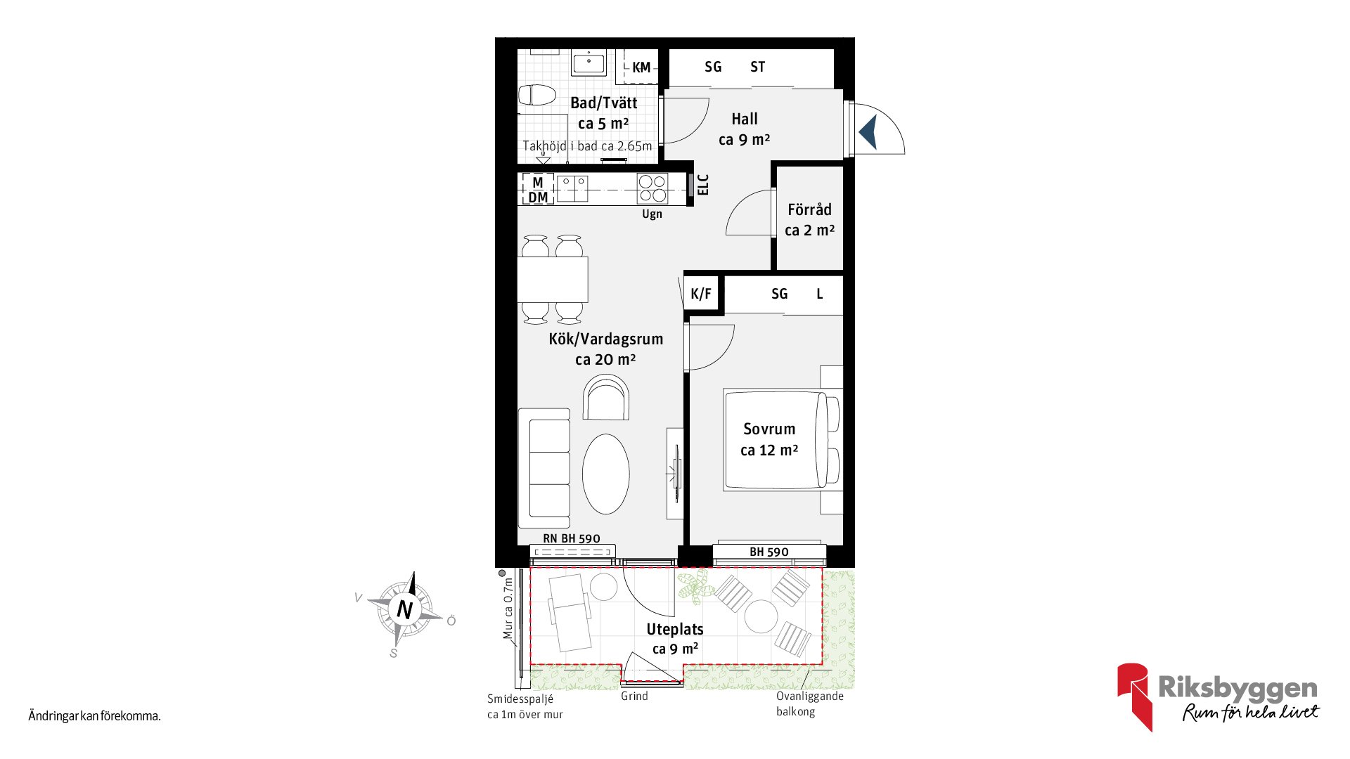 Lägenhet med öppen planlösning och utgång till egen uteplats från vardagsrummet. Rymligt sovrum med skjutdörrsgarderober. Helkaklat badrum med kombimaskin. I sovrummet finns skjutdörrsgarderober och det finns dessutom gott om förvaring i ett förråd i hallen.