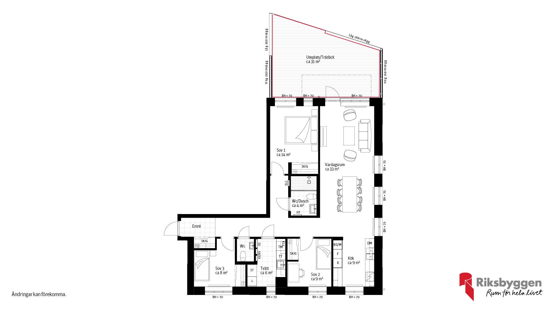4 rum och kök i markplan med en uteplats som mäter hela 31 kvm i lugnt sydväst läge. Öppen och luftig planlösning med dagsljus från tre väderstreck. Badrum med stort duschutrymme i nära anslutning till det stora sovrummet. Det stora sovrummet, liksom de två andra har inbyggda skjutdörrsgarderober för bra förvaring. Separat tvättstuga så du slipper ha eventuellt stök i sikte. Här finns såklart både tvättmaskin, torktumlare och förvaringsmöjligheter.
