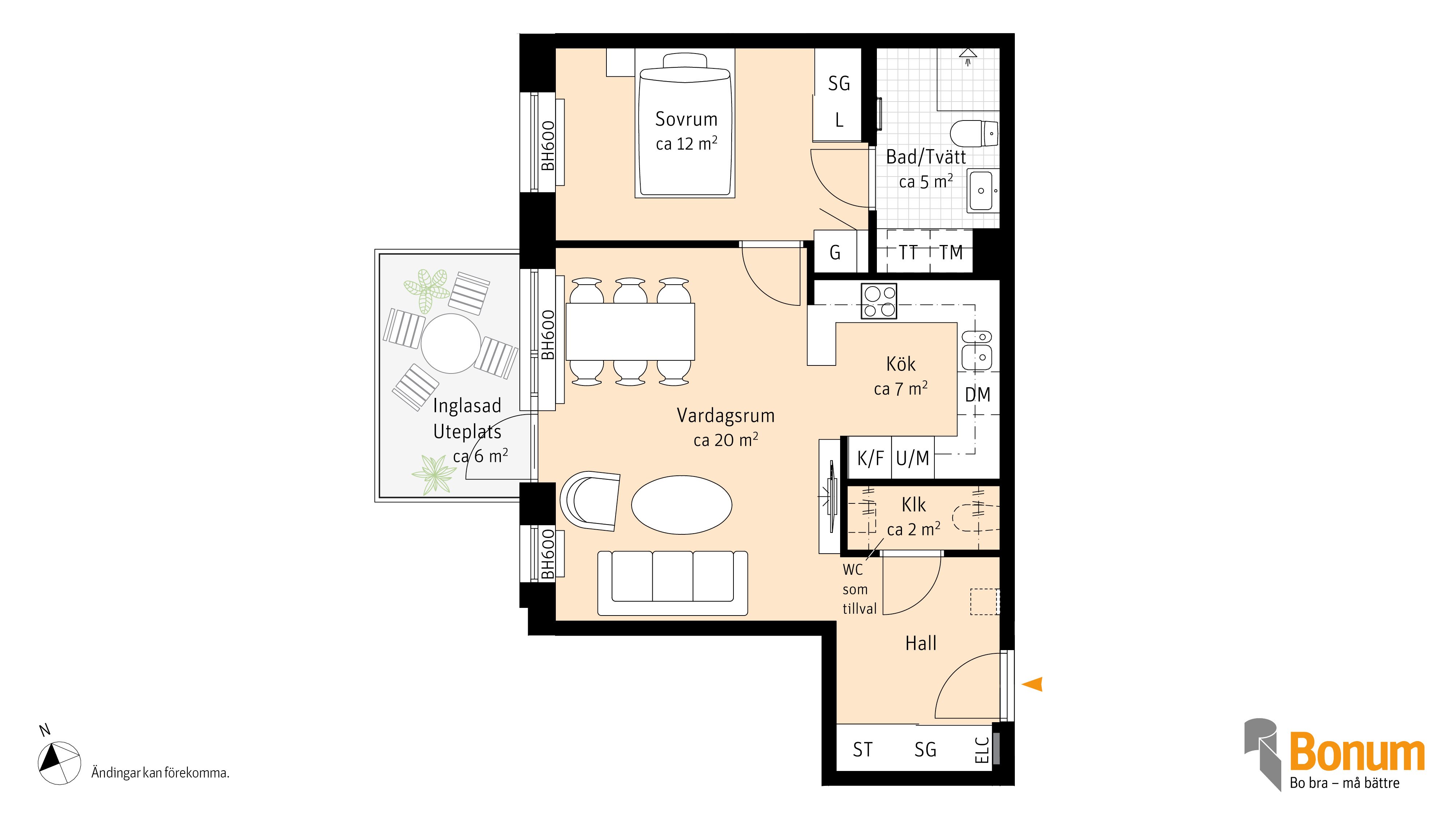 Charmig lägenhet med genomtänkt planlösning. Lägenheten har ett stort vardagsrum med direkt anslutning till kök i vinkel. Köket har gott om arbetsytor, diskmaskin, kyl/frys och mikro. Sovrummet ligger precis vid det helkaklade badrummet, som är välplanerat och funktionellt, och har tvättmaskin och torktumlare. I anslutning till hallen finns det en klädkammare som erbjuder bra förvaringsmöjligheter. Lägenheten har dessutom en inglasad uteplats på 6 kvm.