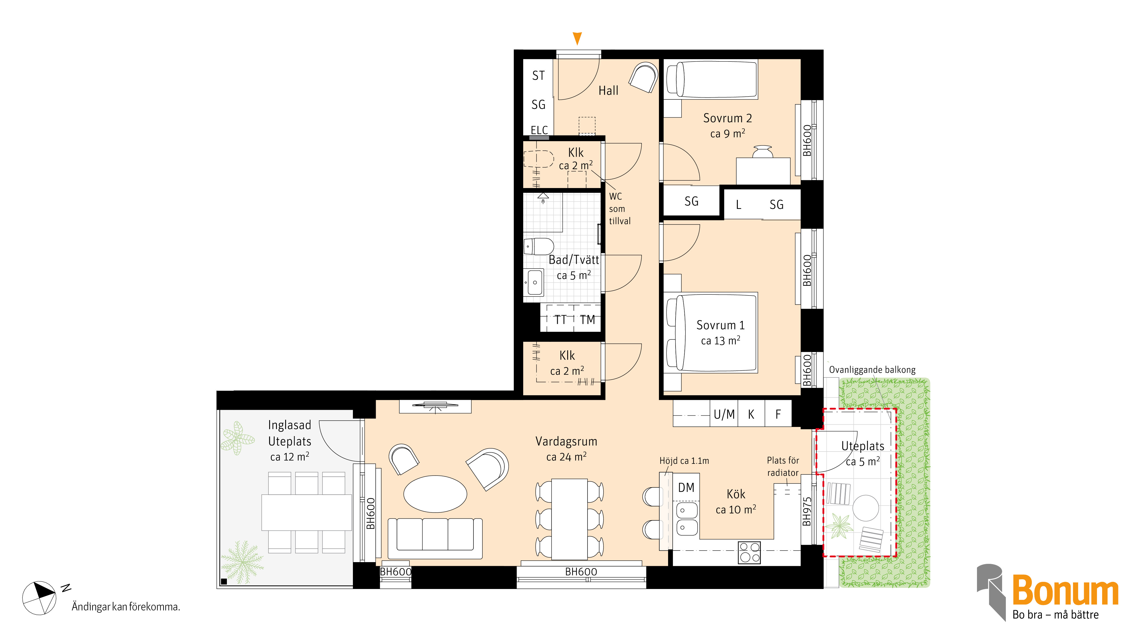 Välplanerad trea med genomtänkt planlösning. Lägenheten har ett rymligt vardagsrum som naturligt flyter samman med det moderna köket. Perfekt både när man gäster och för mysiga hemmakvällar. De två sovrummen har garderober och det finns dessutom en klädkammare i lägenheten. Badrummet är funktionellt med tvättmaskin och torktumlare. Det som gör den här lägenheten extra speciell är att det finns både en inglasad uteplats samt en mindre uteplats för möjlighet till både morgon- och kvällssol.