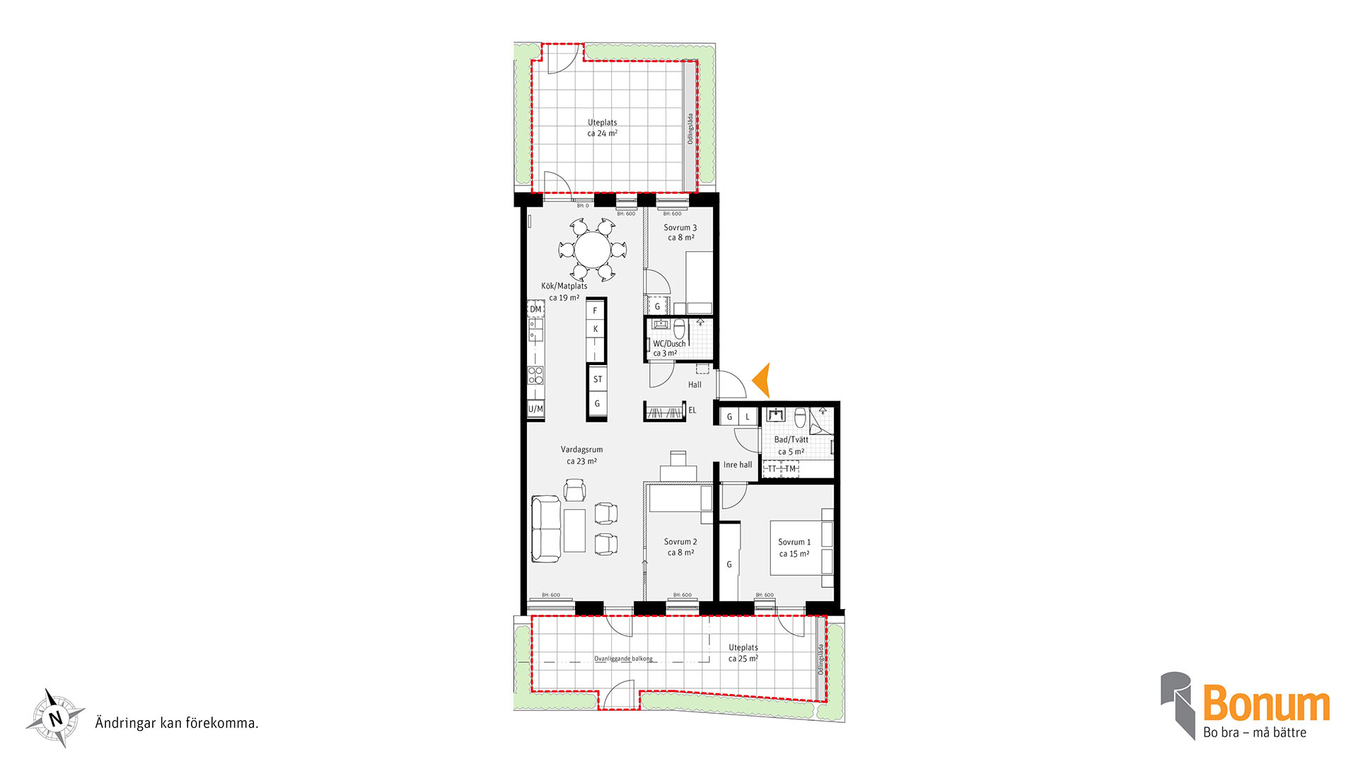 Genomgående lägenhet i markplan med två uteplatser varav en av uteplatserna ligger i sydvästläge. Flexibel planlösning med möjlighet till större vardagsrum och kök. Lägenheten har både ett badrum med tvättmaskin och torktumlare samt ett WC/Dusch. Bläddra i inredningsmagasinet för att välja inredning i din nya bostad. I lägenhetsväljaren kan du se var lägenheten ligger i huset.
