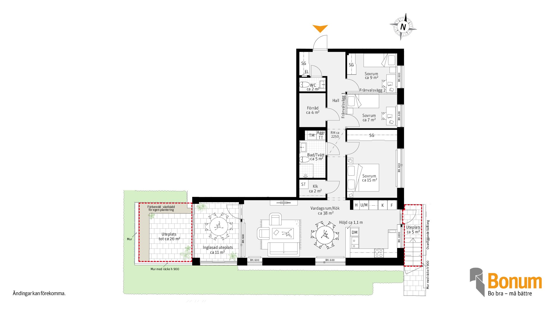 Stor marklägenhet med två uteplatser, en i öster och en i väster mot Surbrunnsplan. Stort vardagsum med utgång till den inglasade delen av uteplatsen. Generöst huvudsovrum med mycket bra förvaring i skjutdörrsgarderober. Lägenheten är möjlig att göra om till en trea om så önskas.