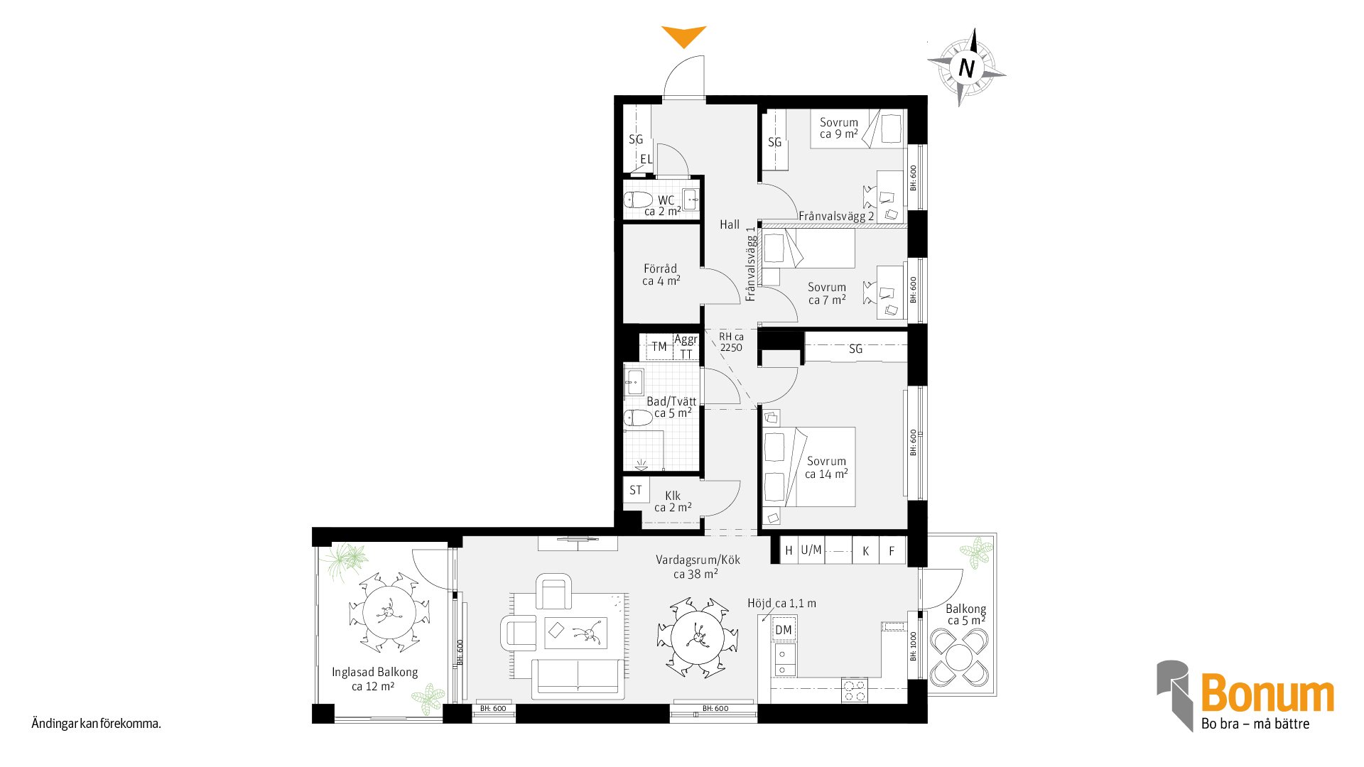 Stor fyra med två balkonger, en i öster och en i väster. Balkongen i väster är inglasad. Stort vardagsum med utgång till den inglasade balkongen. Generöst huvudsovrum med bra förvaring i skjutdörrsgarderober. Gästtoalett. Lägenheten är möjlig att göra om till en trea om så önskas.