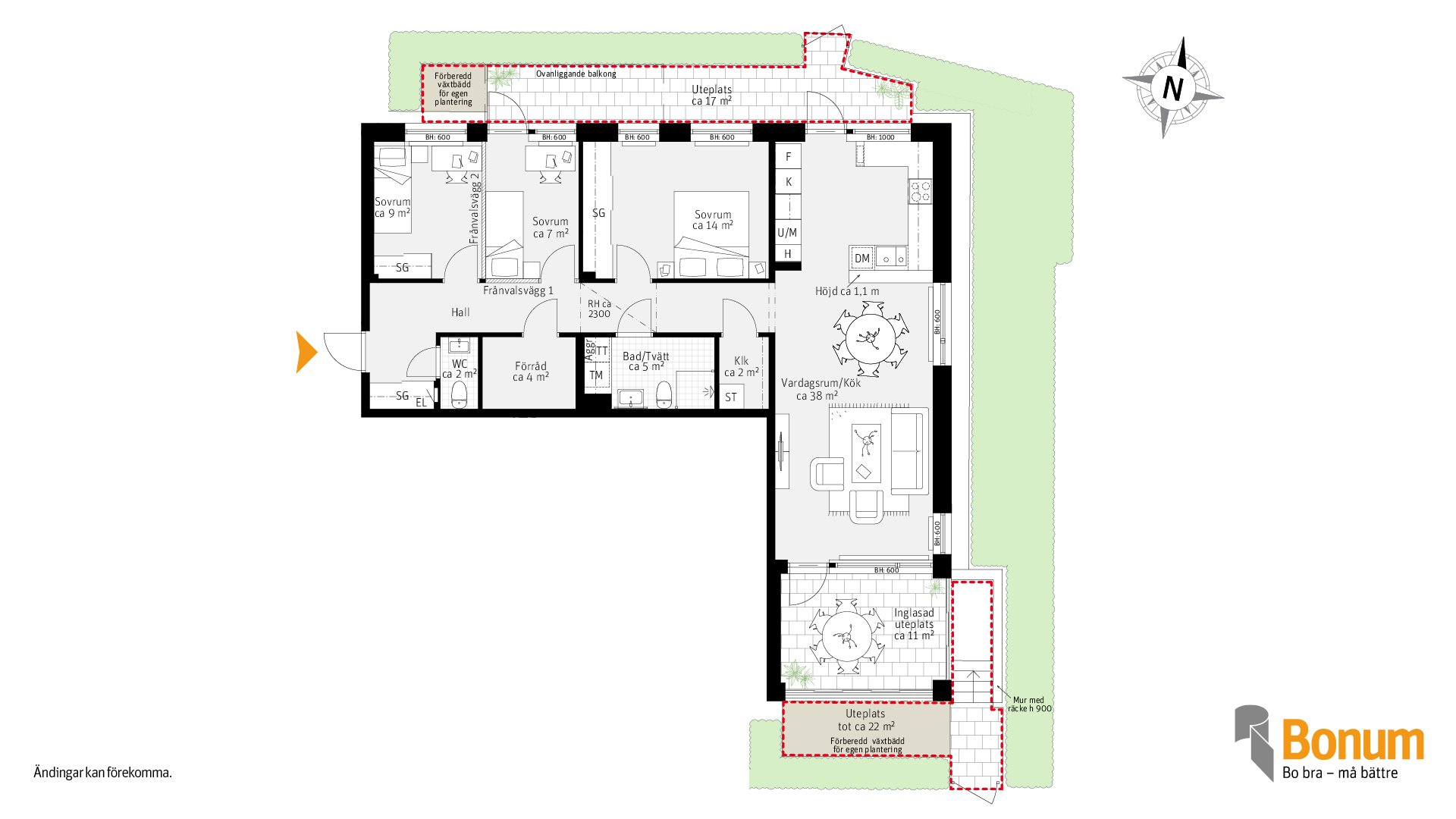Generös marklägenhet med två trevliga uteplatser. Vardagsrum och kök över hela gaveln. Stort huvudsovrum med mycket bra förvaring i skjutdörrsgarderober. Lägenheten är möjlig att göra om till en trea om så önskas.