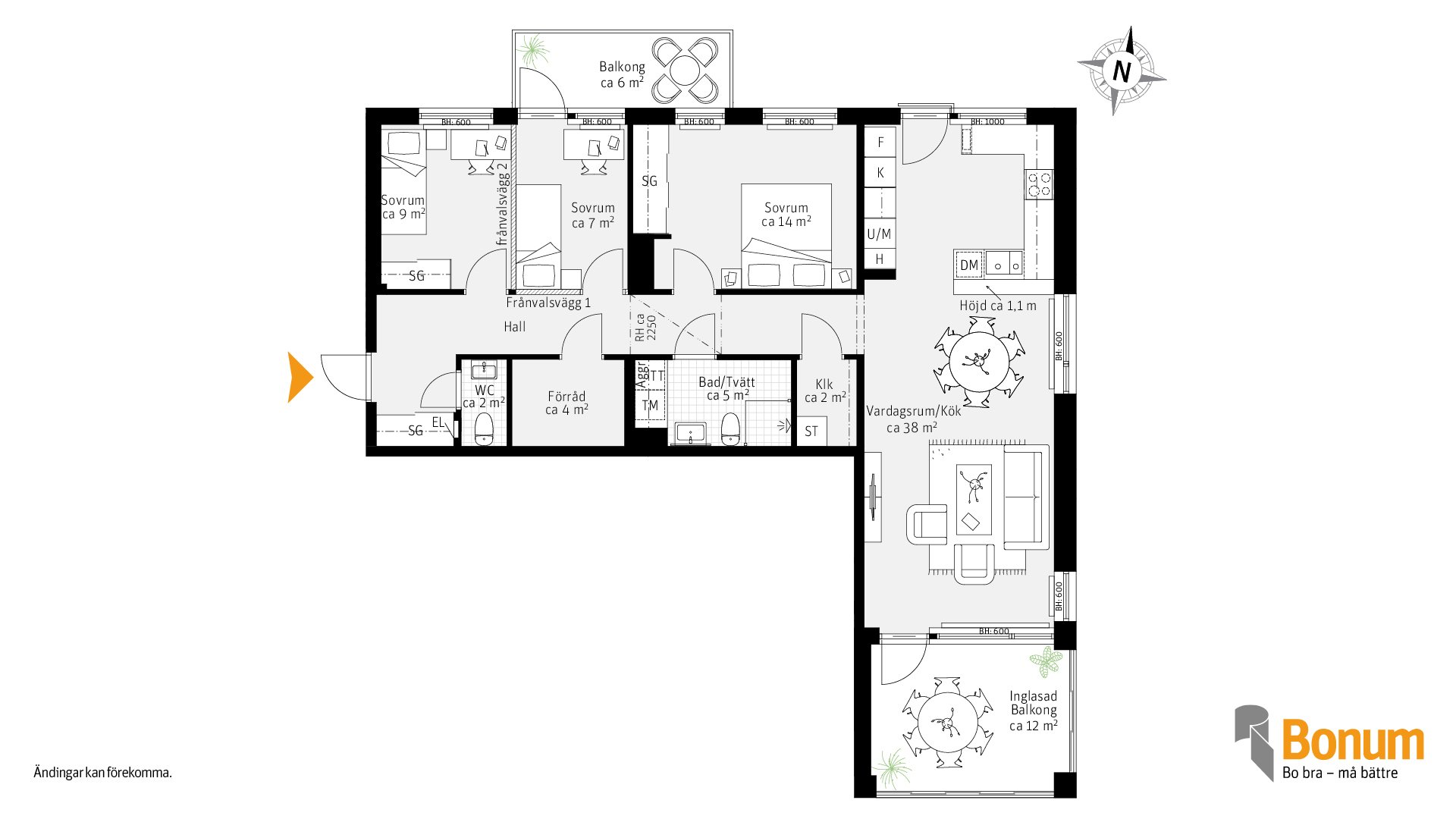 Stor fyra med två balkonger, en i söder och en i norr. Balkongen i söder är inglasad. Stort vardagsum med utgång till den inglasade balkongen. Generöst huvudsovrum med bra förvaring i skjutdörrsgarderober. Gästtoalett. Lägenheten är möjlig att göra om till en trea om så önskas.