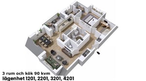 Trerummare med inglasad balkong i sydöst Smakfullt Vedumkök i delvis öppen planlösning mot vardagsrum med plats för både matbord och soffgrupp. I anslutning till köket finns ett praktiskt skafferi. Två avskilt placerade sovrum, varav det större med generös skjutdörrsgarderob. Från hallen nås både rymligt badrum med tvättmaskin och torktumlare samt separat gäst-wc.