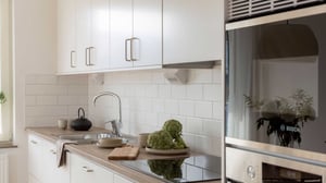 Köket är utrustat med vita köksluckor från Vedum, laminatbänkskiva med trästruktur och ovanför arbetsytorna sitter ett matt vitt kakel i liggande sättning Diskmaskinen är integrerad för ett enhetligt intryck och samtliga vitvaror är i rostfritt utförande: induktionshäll, inbyggnadsugn, mikro samt kyl och frys i fullhöjd. Spiskåpan är av modellen Pandora Green Flow, en energieffektiv och tyst lösning som monteras diskret bakom skåplucka för att bibehålla kökets rena linjer.