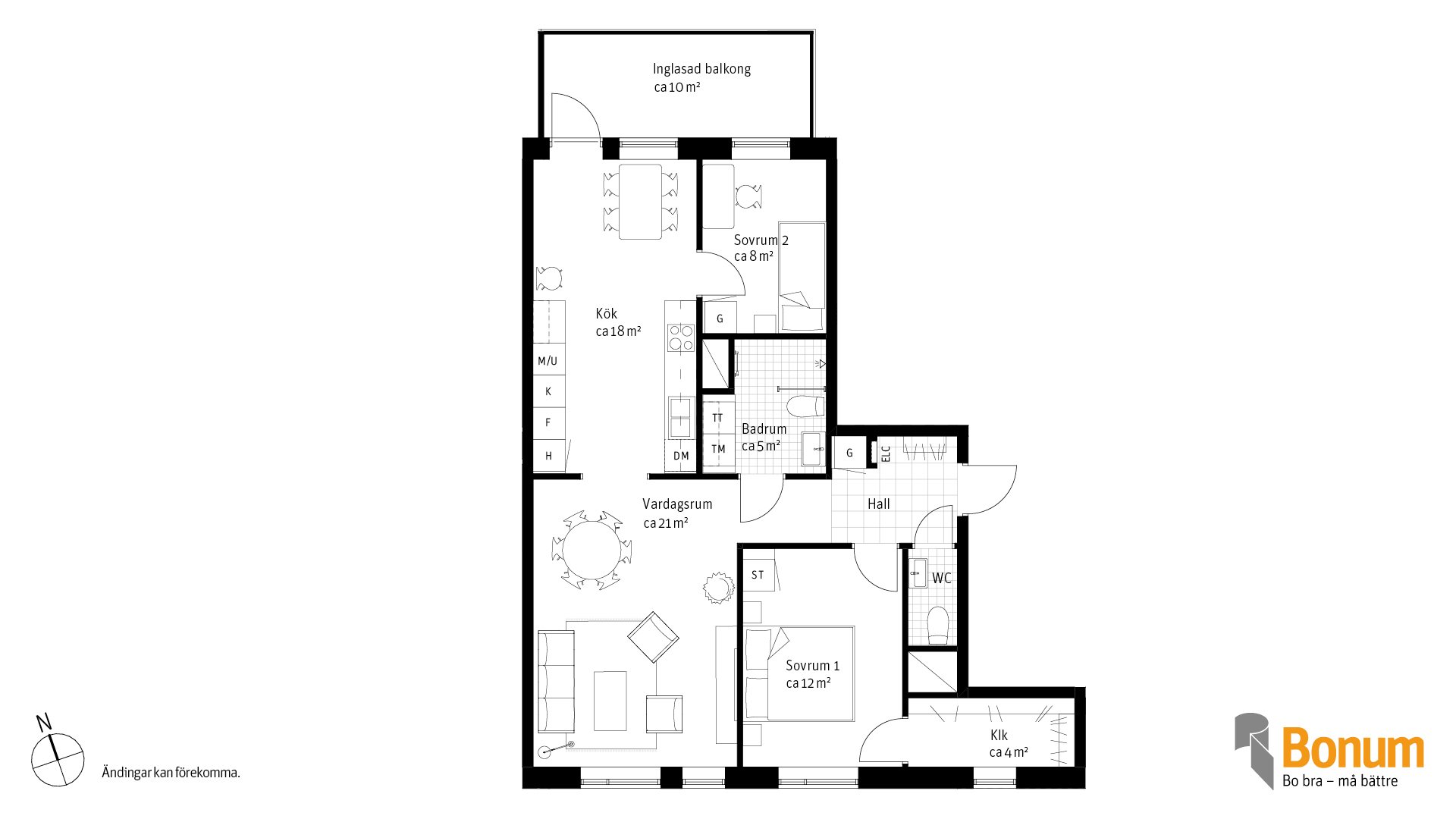 Väldisponerad 3:a på plan två med en inbjudande hall, gästtoalett och helkaklat badrum med tvättmöjligheter. Kök med utgång till inglasad balkong om tio kvm i norrläge. Lägenheten har dessutom ett rymligt vardagsrum. Ett sovrum med plats för garderober och klädkammare, och ett mindre sovrum för gäster eller kontor.