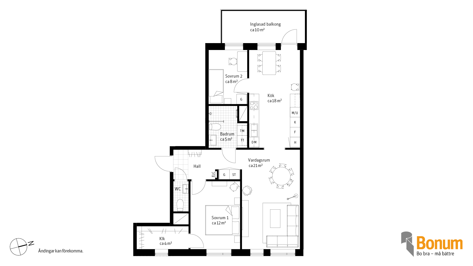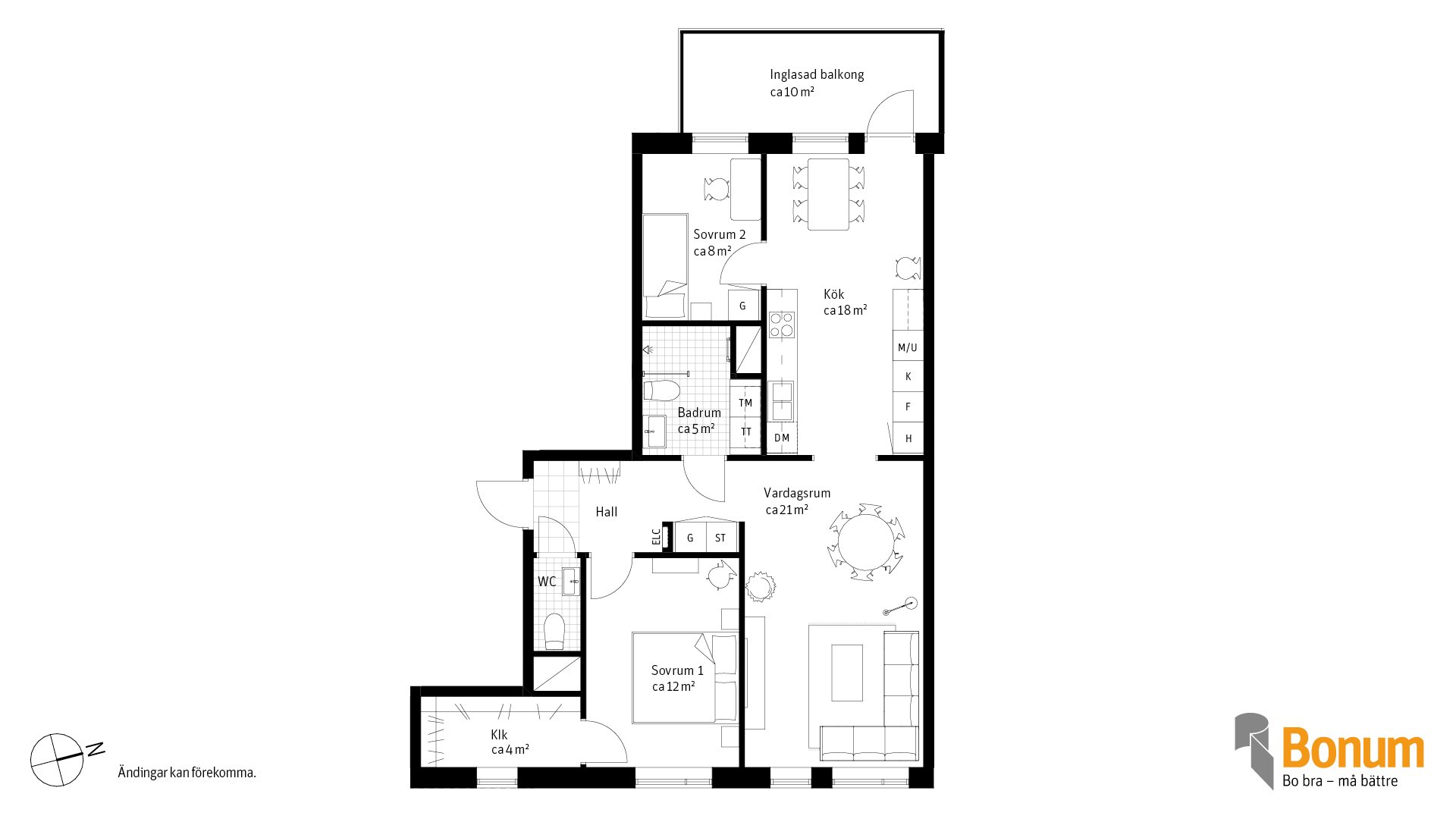 Väldisponerad 3:a om 81 kvm på plan 1 med en inbjudande hall, gästtoalett, helkaklat badrum med tvättmöjligheter, kök med utgång till inglasad balkong om 10 kvm i västerläge, rymligt vardagsrum. Ett sovrum med klädkammare och plats för garderober, och ett mindre sovrum för gäster eller kontor.
