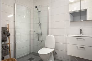 Även ditt nya badrum har inretts med omsorg om detaljerna. För att helhetsintrycket ska hålla stilen i hela lägenheten har våra inredare noga valt ut kakel och klinker så att det matchar inredningen i köket.