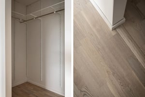 Rummen har vitmålade väggar och socklar. Golven har vitpigementerad, mattlackad 3-stavsparkett.