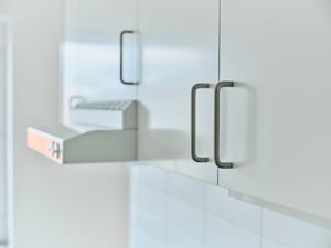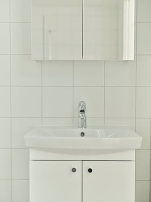 Badrummen har vitt kakel och ljusgrått klinkergolv. Det finns både överskåp med tillhörande spegel och kommod under handfat för god förvaring. Samtliga badrum har dusch med vikbar halvfrostad duschvägg och är förberedda för tvättmaskin/torktumlare som tillval.