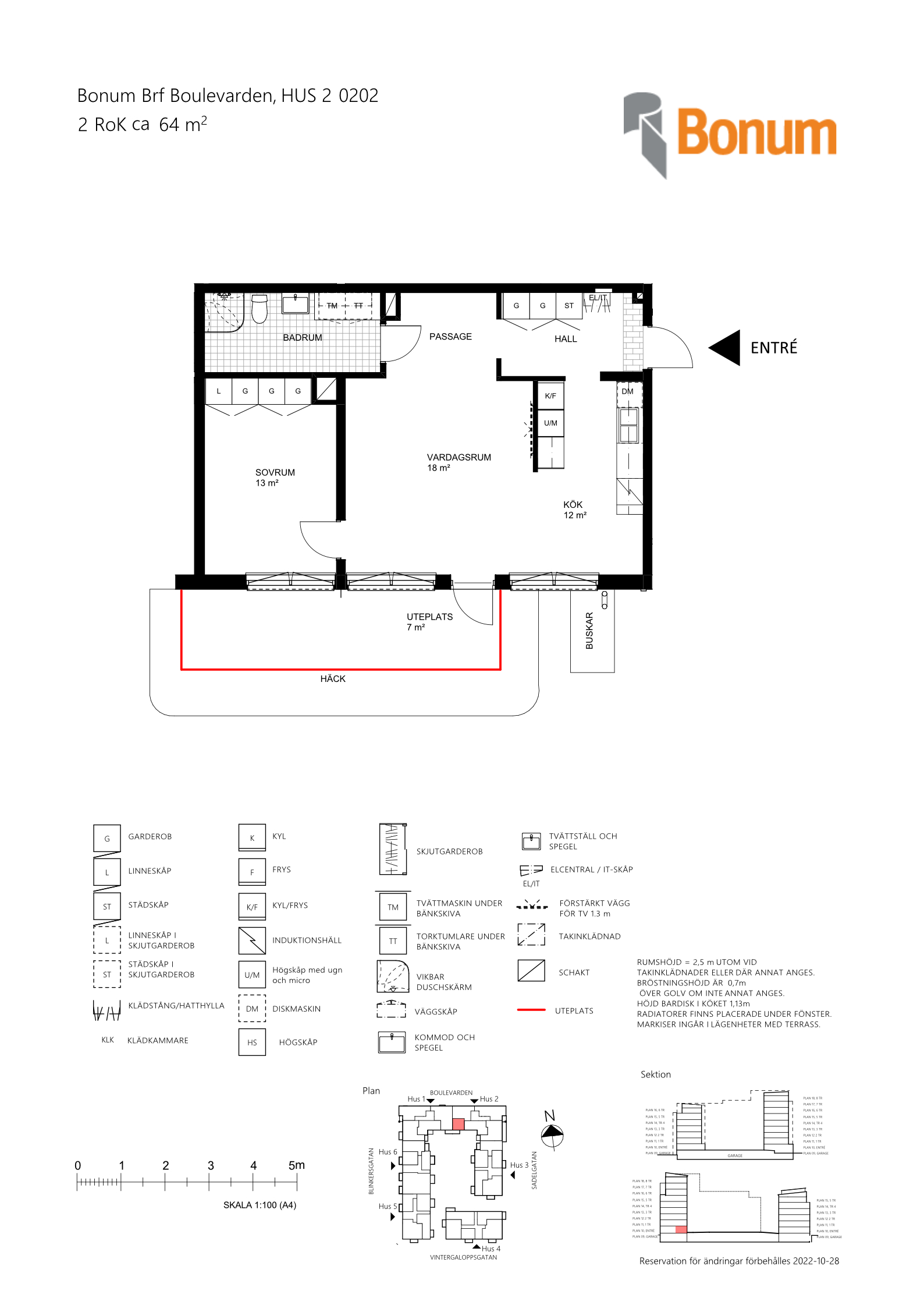 2:a på entréplan med uteplats i söderläge mot innergård. Hall med 1 kvm klinkergolv, hatthylla och två garderober. Trivsam rundgång i bostaden med halvöppen planlösning mellan kök och vardagsrum. Kök med inredningsstil Harmoni med vita köksluckor och vitt kakel. Badrum med inredningsstilen Harmoni med vitt kakel, ljusgrå klinker. Dusch med svängda dörrar, förhöjd wc, tvättställ med vit kommod, TM och TT. Från vardagsrum nås sovrum om 13 kvm med god förvaring. Källarförråd finns.