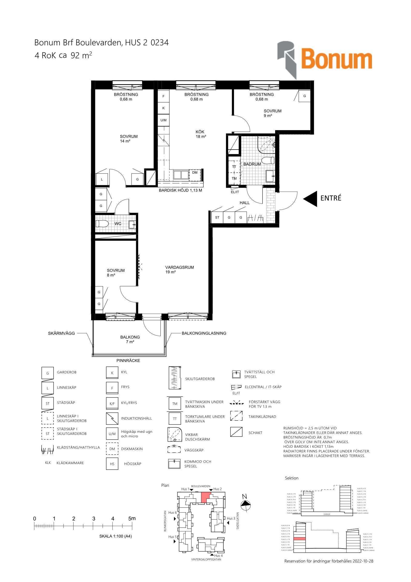 Golv vitpigmenterad ask och vitmålade väggar. Rostfria vitvaror. Köket är utrustat med kyl och frys eller kombinerad kyl och frys, induktionshäll, diskmaskin, ugn och inbyggnadsmicro.