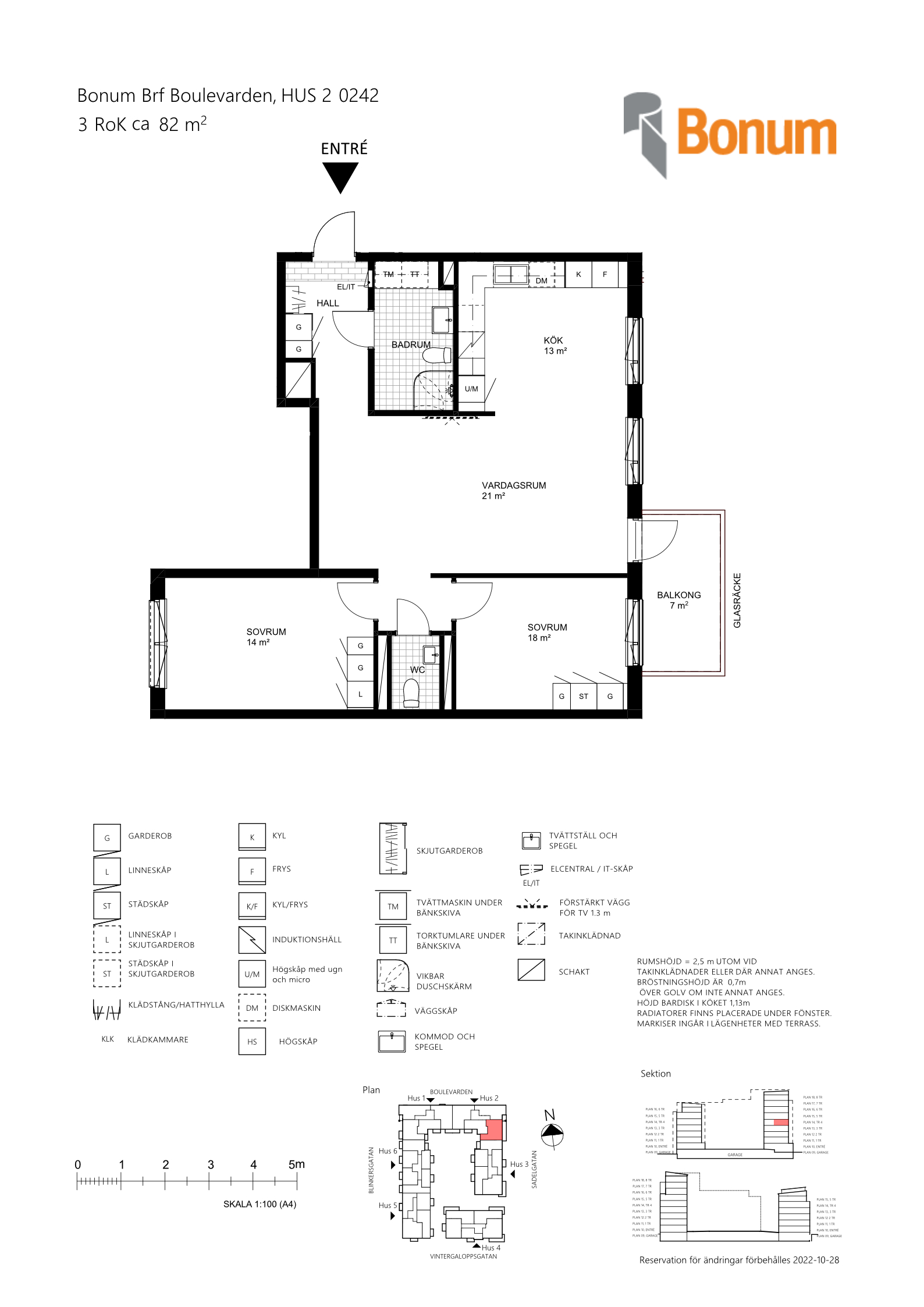 3 rok om ca 82 kvm med extra wc, på våning 4 med balkong i österläge. Genomgående lägenhet med öppen planlösning mellan kök och generös vardagsrum. Köksinredning Harmoni med gråa köksluckor och vitt kakel. Badrum i Harmoni med vitt kakel, ljusgrå klinker, vit kommod, dusch med svängda dörrar samt TM och TT. Extra WC finns. Två rymliga sovrum. Källarförråd tillhör bostaden.