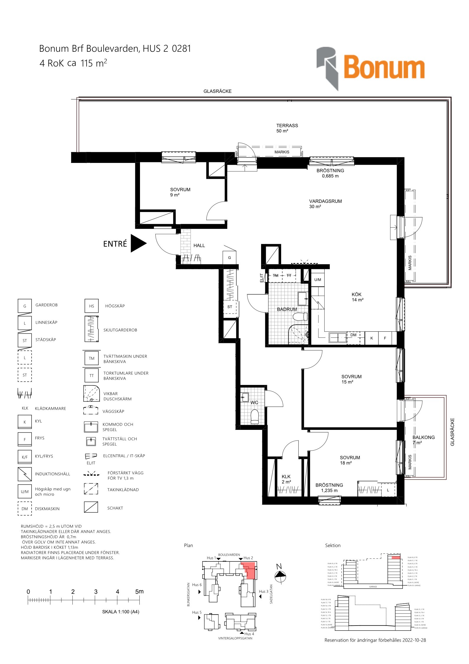 Största fyran i huset ligger högst upp i huset. Den har en generös terrass om 50 kvm i norr- och österläge med markis. Rymlig mingelvänlig öppen planlösning mellan kök och vardagsrum. Köksinredning med gråa köksluckor, köksbänk i kompositskiva och vitt kakel. 3 sovrum, varav det största är 15 kvm med utgång till balkong i öster. God förvaring med både skjutdörrsgarderob och klädkammare. Badrum med inredningsstil vit Harmoni med vitt kakel, ljusgrå klinker. Extra wc. Källarförråd tillhör bostaden.