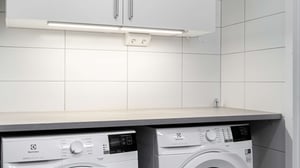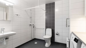 I badrummen är det kaklade väggar och praktiskt våtrumsmatta och här finns ett handtag monterat i duschen för att minska risken för halkolyckor. Badrummen är omsorgsfullt inredda med ljusa färger och material som ska hålla över lång tid och utrustade med tvättmaskin och torktumlare under praktisk bänkskiva med väggskåp ovan för möjlighet till extra förvaring.