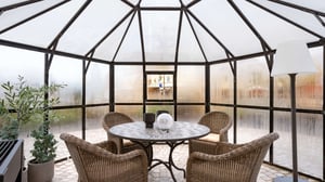 Trygghetsboendet har gemensamma utrymmen såsom allrum med kök och övernattningsrum. I allrummet är det gott om sittplatser och dörrar ut mot den gemensamma trädgården och lusthuset.