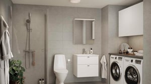 Badrumsinredning från Vedum. Vit kommod med lådor och tvättställ i porslin. Spegelskåp med LED-belysning.