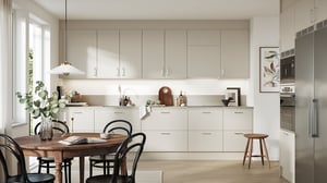 Det beigea Signaturköket från Vedum kombinerar modern design med genomtänkta materialval. Här får du en laminatbänkskiva med stenmönster och uppvik, underlimmad diskho och rostfria vitvaror med hög energiklass. Släta linnebeige luckor, infälld LED‑belysning och utdragbara och mjukstängande lådor skapar ett kök som både är snyggt och enkelt att leva i.