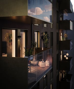 Alla bostäder har balkong eller uteplats, och högst upp i varje hus väntar en takterrass med milsvid utsikt över Västerås. Inflyttning planeras till Q2 2027.