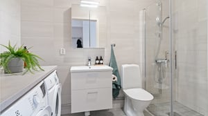 Njut av fönsterbänkar i natursten, vitmålade väggar och parkettgolv. Interiören präglas av klassiska och smakfulla materialval. Vita kök från Vedum som är utrustade med dämpade fullutdragslådor och rostfria vitvaror och här finns diskmaskin, induktionshäll, mikrovågsugn, varmluftsugn, kyl och frys alt. kyl/frys. De helkaklade badrummen är utrustade med dusch och vikbara duschväggar, handfat med vit kommod och spegelskåp ovanför, toalett, tvättmaskin och torktumlare alt. kombimaskin. Ovanför maskinerna finns en praktisk arbetsyta med bänkskiva i ljusgrå laminat, perfekt för att enkelt och bekvämt sköta tvätten eller ta hand om de allra minsta i familjen.